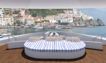 Since the yacht isn’t set for delivery until 2013, some interior features are yet to be determined. Even with that, however, expect things like fluted columns and raised-panel woodwork. In addition, the owners were absolutely certain of one thing: Flexibility in arrangements was a must. The owners may have just a few friends and family with them one week, for example, and then entertain big groups another week. Therefore, several spaces throughout the decks will be set up to transform according to need. Pantries will be on each deck, too, to make the crew’s job easier.