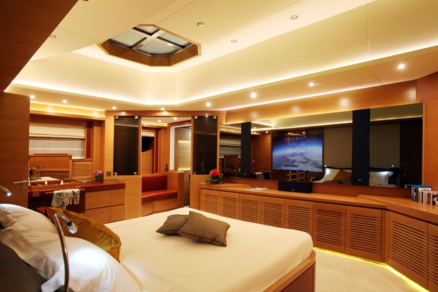 Nicolai’s influence is further seen in the owner and guest spaces. They’re of the level and finish you’d expect of a semi-custom yacht. (IAG Yachts is offering future 127s with engineering and machinery set but interiors open to personalization.) Oak and wenge wood paneling flows from the saloon and dining area through to the full-beam master suite forward (above). A nice touch here is the skylight above the bed. At the flick of a switch, it can become opaque. The bedroom also contains a small seating area, ideal for morning coffee, and a separate office. The four guest staterooms below decks and a VIP stateroom just forward of the skylounge are also outfitted with wenge and oak, plus bamboo. Primadonna was built with charter in mind, and the layout would certainly accommodate it. (The yacht is classed to RINA for unrestricted navigation and further is MCA compliant.)