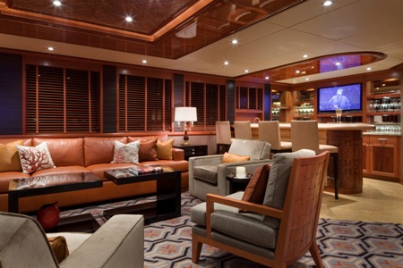 Barnett also makes good use of stone throughout Project Monarch’s four decks (all of which are wheelchair accessible, a nice touch). There’s beautiful marble work on the skylounge bar, forward to port, adjacent to a walk-in wine room. Sweeping stone countertops adorn another bar area on the sundeck, with a mosaic of stone tiles wrapping around its base. A similar mosaic adorns the bulkhead facing the hot tub on the same deck, making for a dramatic backdrop.