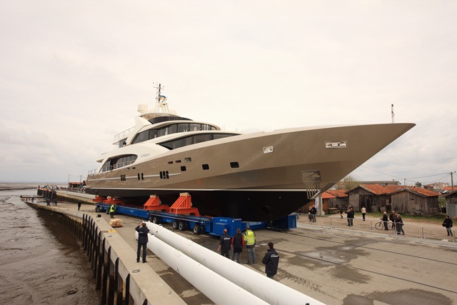 The first launch in the 5000 Fly series from Couach Yachts, La Pellegrina was lowered into the water while a crowd of 3,000 people watched this past weekend. The 162-foot (49.5-meter) La Pellegrina is the largest-ever megayacht from the French builder. The photo gallery here showcases her movement from the build shed to the water, then onto her sea trials.