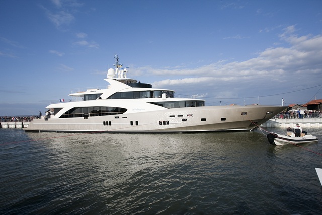 Visitors to the Monaco Yacht Show in September will get a chance to see the trideck La Pellegrina and her interior, designed by Jean-Pierre Fantini. Charter clients will get aboard even earlier, starting in July. Details on La Pellegrina’s décor remain confidential, though the yard has revealed six staterooms accommodate the owner’s party. It also says 10 crewmembers are housed aboard. La Pellegrina bears a beam of 30’5” (9.3 meters).