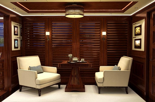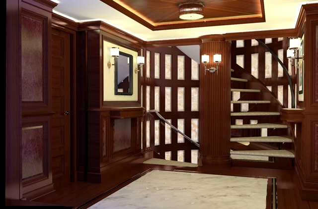Within the main staircase, which connects all decks, backlit, hand-carved onyx panels adorn the bulkheads. The onyx panels are carved in vignette images, all of which depict experiences of the owner and his family during past travels of the globe. The ambience of the illuminated inset onyx panels sets the tone for the public spaces of the yacht’s interior, while providing a gallery in which to gaze at a storybook of family experiences.”