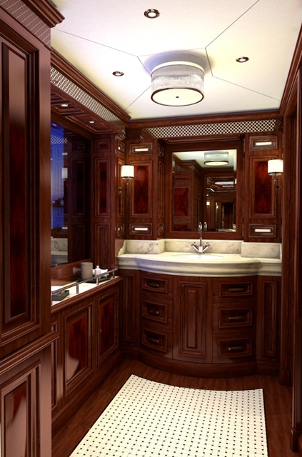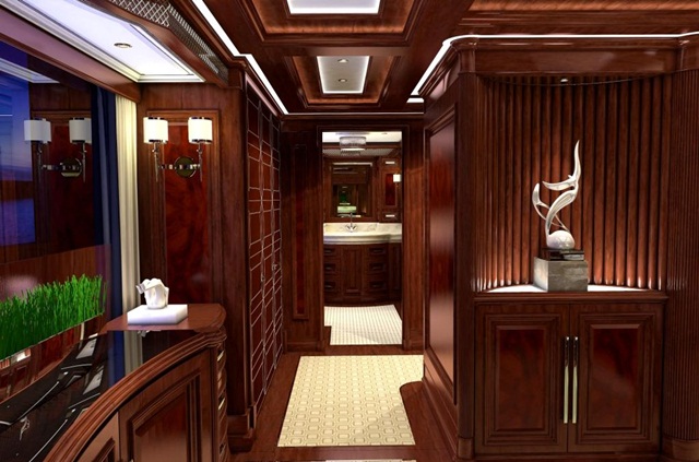 “Some of the design elements that are not as noticeable in the photos include details such as hand-stitched leather doors in the wardrobe, backlit onyx tops on the nightstands, custom polished nickel ventilation grills, polished nickel inlays in the perimeter wood border of the decks, as well as an unusual amount of indirect lighting within the overheads, soffits, valances, and furniture.