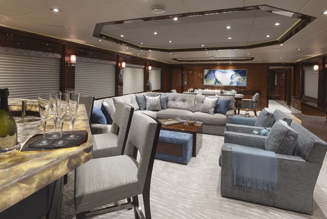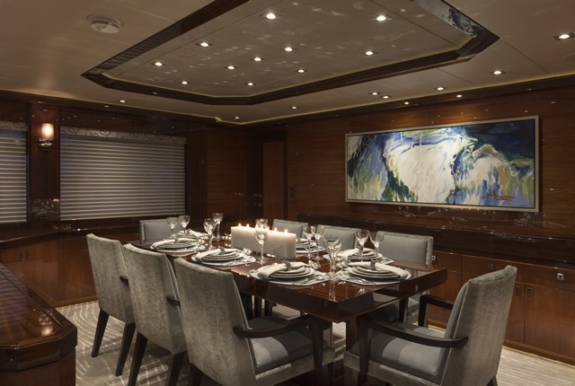 Sapele wood, both light- and dark-stained, is found aboard Finish Line. The owner wanted dramatic elements throughout the megayacht, too. That’s why the sapele grains alternate horizontally and vertically, and why polished stainless steel serves as inlays. Joanne Lockhart of interior-design firm Yacht Next further had the quartzite-topped bar backlit.