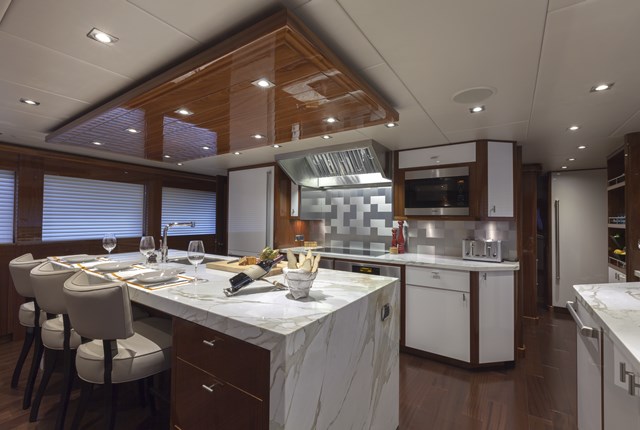 Even the galley aboard Finish Line is a showplace. “He’s a huge foodie,” Joanne Lockhart says of the owner. The galley therefore is as much a social space for him to entertain and even cook for family as it is a crew workspace. Note the marble-topped prep/dining area. Though not visible, the wine fridge has a custom front complementing the design of the marble and glass sole leading into the galley.
