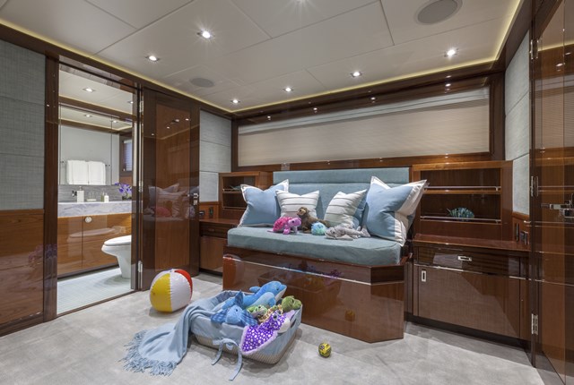 Finish Line is very much a family boat. Therefore, the owner wanted a playroom for toddlers among the four guest staterooms. Yacht Next designed and made a twin berth that converts into this configuration. The remaining three staterooms have queen beds, for adults.