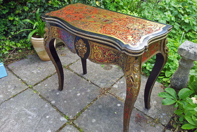 At its UK-based workshop, Onlyacht’s team identified several areas in need of repair. The French oak was marred in some spots. It was mostly due to the breakdown of the original glue used to secure the surface veneer of brass, tortoise shell, and ebony. Furthermore, sections of the brass and shell had either broken off or come away from the surface. They needed replacing, cleaning, and re-securing. For aesthetics, Onlyacht aged the brand-new pieces. Then, every brass pin in every mount was removed, cleaned, waxed, and put back in place. The final touches: waxing the full table as protection against the salt air.
