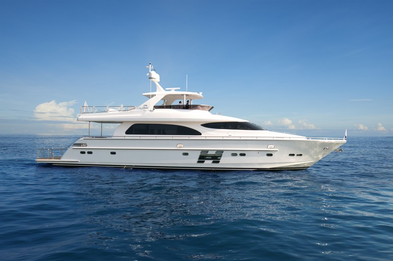 Great Lakes boaters are well aware of the low bridges that dot local waterways. The newest Horizon E78 was built with situations like this in mind. At the press of a button, her hardtop lowers. This reduces the megayacht’s height by 8½ feet (about 2.6 meters).