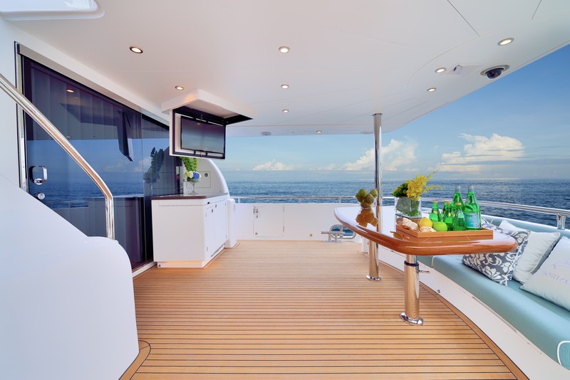 The hardtop isn’t the only hi-lo item aboard the yacht. The Horizon E78 also features a lowering swim platform. It further extends out a little more than six feet (1.8 meters). This allows it to stow watertoys or simply suit swimmers and those who like to sit with their legs in the water. Seeing as Horizon buyers cruise not just inland, but also the coasts and the Bahamas, it’s a good feature for the E78.