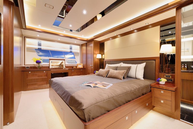 Here’s more of the Horizon E78, with three staterooms (including the full-beam master). Top speed should be 25 knots under full load, powered by twin 1,600-hp Caterpillars.