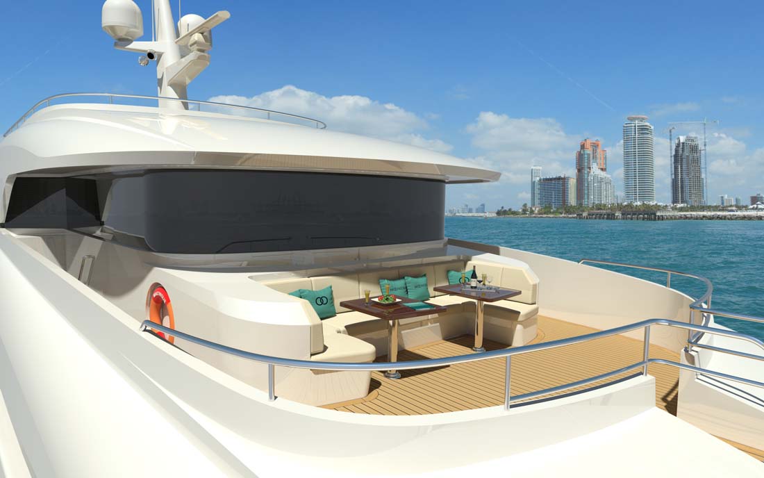 The goal of the Martinique—and indeed the full Caribbean series—is to cater to warm-weather cruisers who sometimes enjoy skinny-water destinations. That’s why the Martinique’s draft should be in th seven-foot (2.1-meter) range. Furthermore, the model and the rest of the Caribbean series freshen up the looks of Moonen’s offerings. While its previous popular motoryachts, such as the Moonen 97 and Moonen 99, have appealed to traditionalists, the Dutch builder wanted to attract buyers with more modern tastes in styling, too.