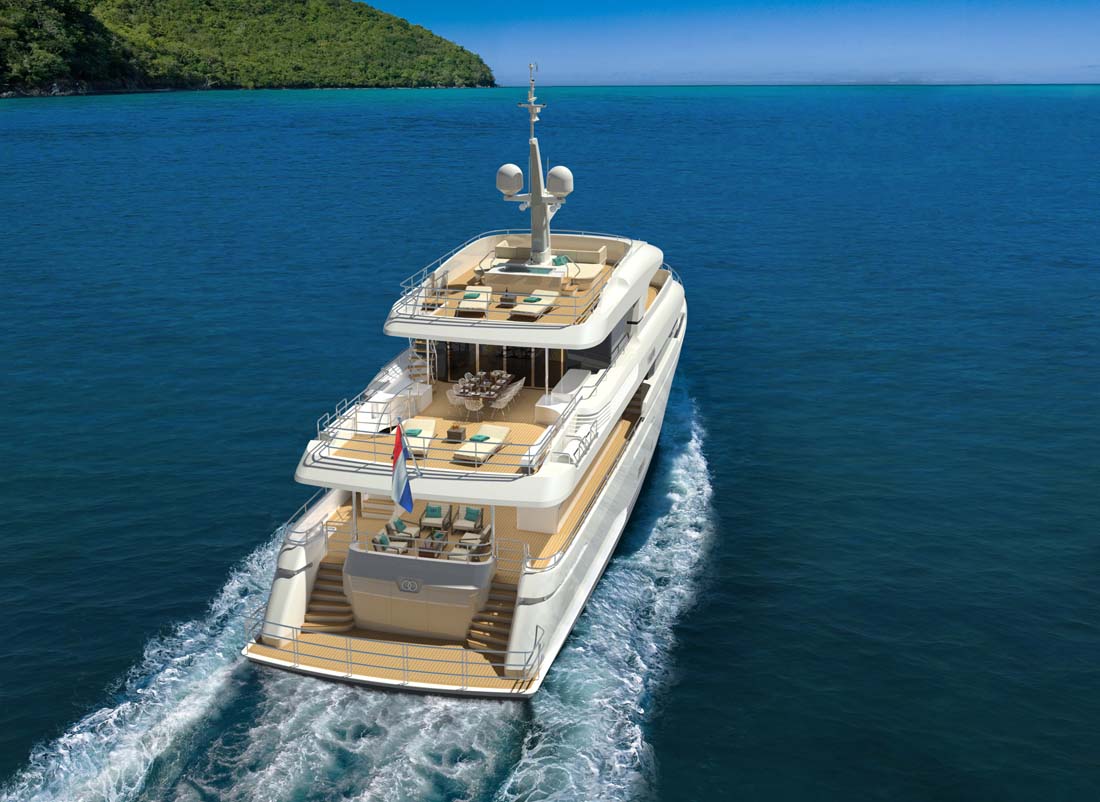 As you may recall from a story we published last year, Moonen Shipyards is building the first model in its Caribbean series, the Martinique. The hull and superstructure for the 120-foot (38.58-meter) motoryacht are currently under construction, for completion next year. So far just a profile or two of the Martinique has been shown. In this gallery, we give you additional views of on-deck and interior spaces, the latter being fashioned by Nauta Design.
