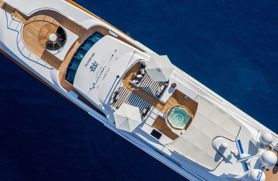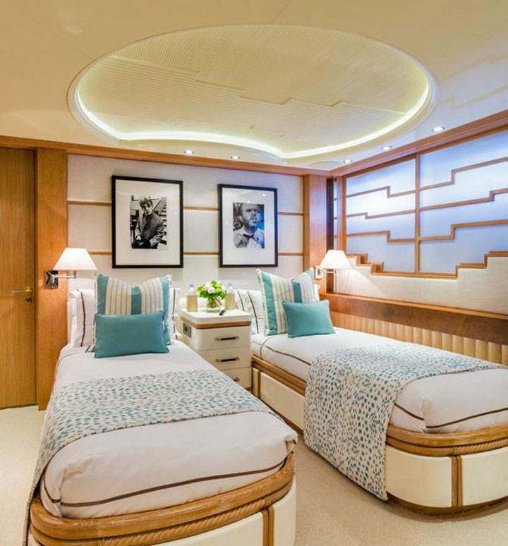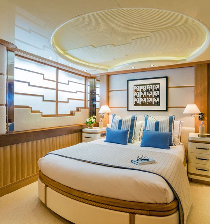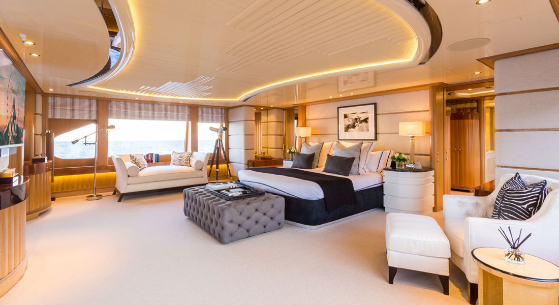 One of the highlights of QM of London has long been her unusual stateroom layout. She has seven staterooms, including the owners’ suite. It’s unusual for this setup to be found on the charter market. In total, the staterooms include two VIPs, four guest staterooms, and of course the master occupying the full beam. The configuration can suit big charter parties, or those who have staff accompany them.