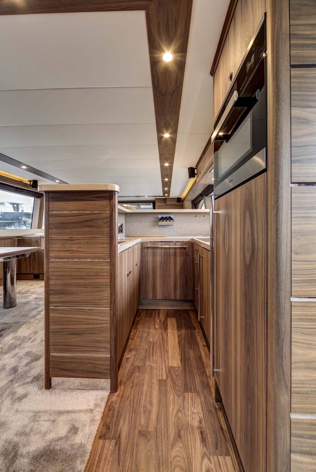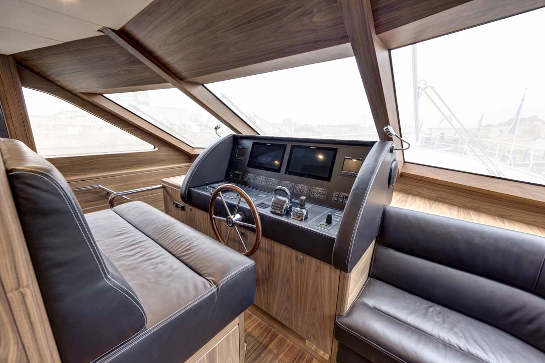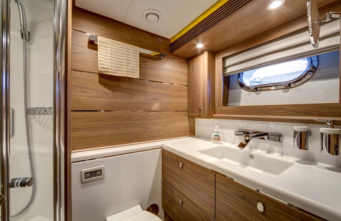 This photo gallery lets you better see the black walnut interior of Selena, accentuated with stainless steel. Selena will spend her first summer afloat in the Adriatic. There, she’ll surely get plenty of opportunity to put her reported 24-knot top speed to the test. Power comes from triple Volvo Penta propulsion, fitted with super-efficient IPS drives. Also in the Adriatic, the owners and guests aboard Selena should be able to put her hydraulic swim platform to good use. It’s ideal for launching a tender or simply for making it easier to climb in and out of the water.