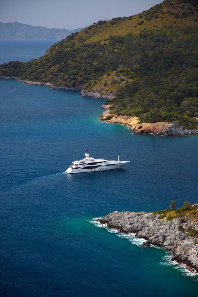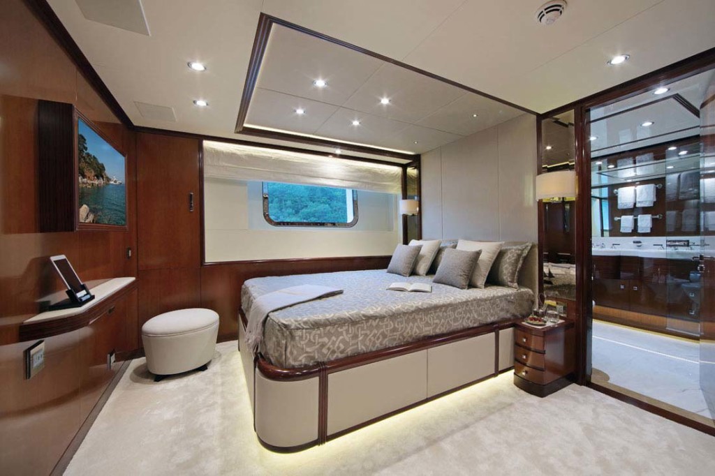 This photo gallery of Vica gives you a better look at her cherrywood-adorned spaces, highlighted by rosewood accents. You’ll also see wrought-iron detailing on the central stairway, a sundeck skylight that spills light down into the lower deck, and peeks at some of her five guest staterooms. Interior design was executed by Benetti and the owners’ decorator.