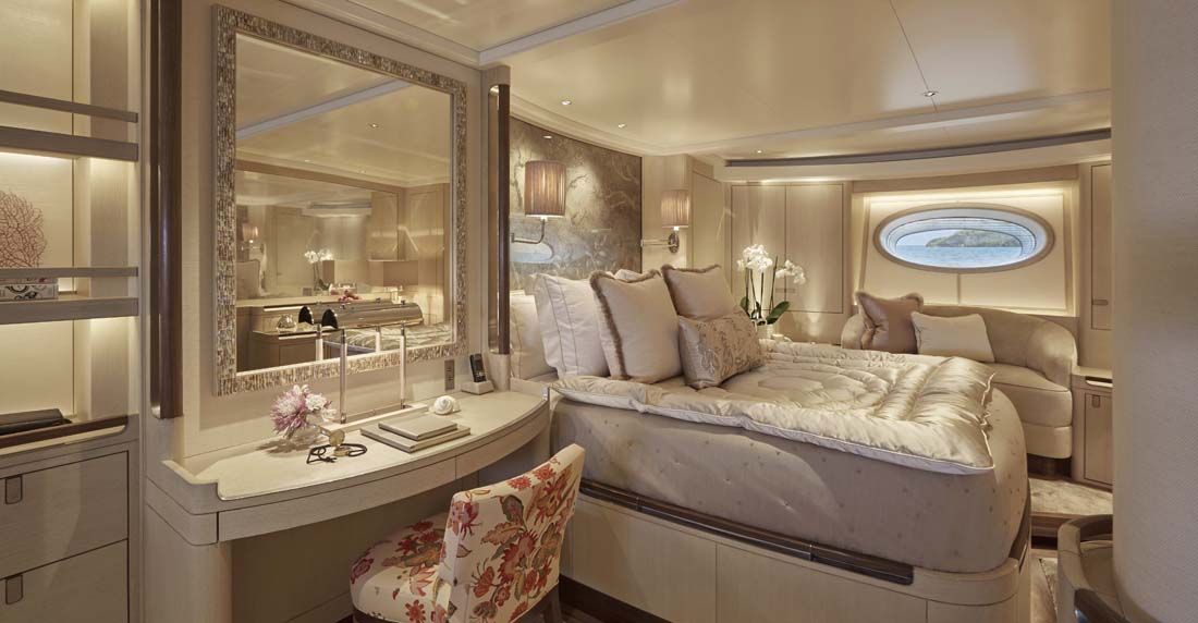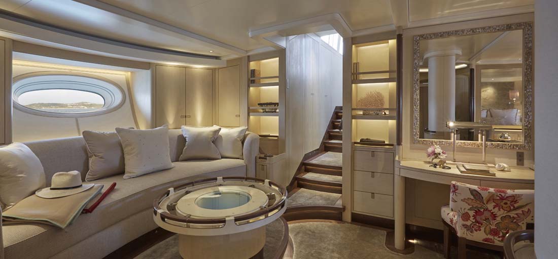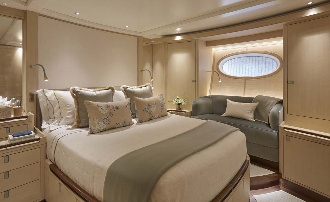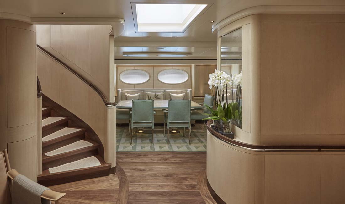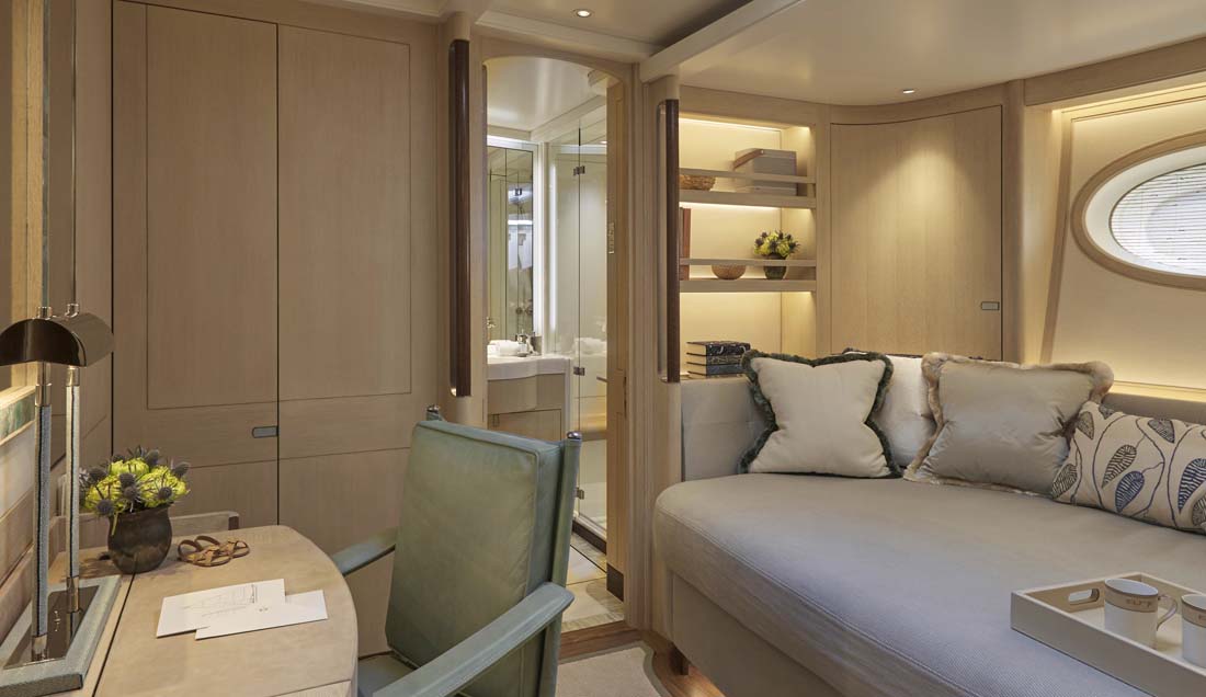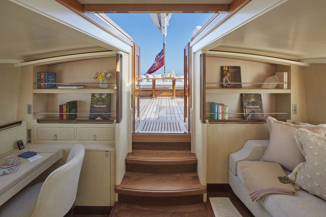 Of course, aesthetics were also key. The ambiance is casual and relaxed, thanks to the work of Redman Whiteley Dixon in conjunction with Pod Interior Style. Though you wouldn’t know it to see the decor, everything was selected with sustainability in mind. Walnut and oak feature prominently in flooring and paneling, and there’s cork underfoot in the crew’s quarters. Furthermore, there isn’t the usual formal separation of crew and guests. Though each have dedicated areas, the galley aboard Elfje, for example, has a welcome drop-down panel between the galley and dining area. This lets a countertop become a breakfast spot.