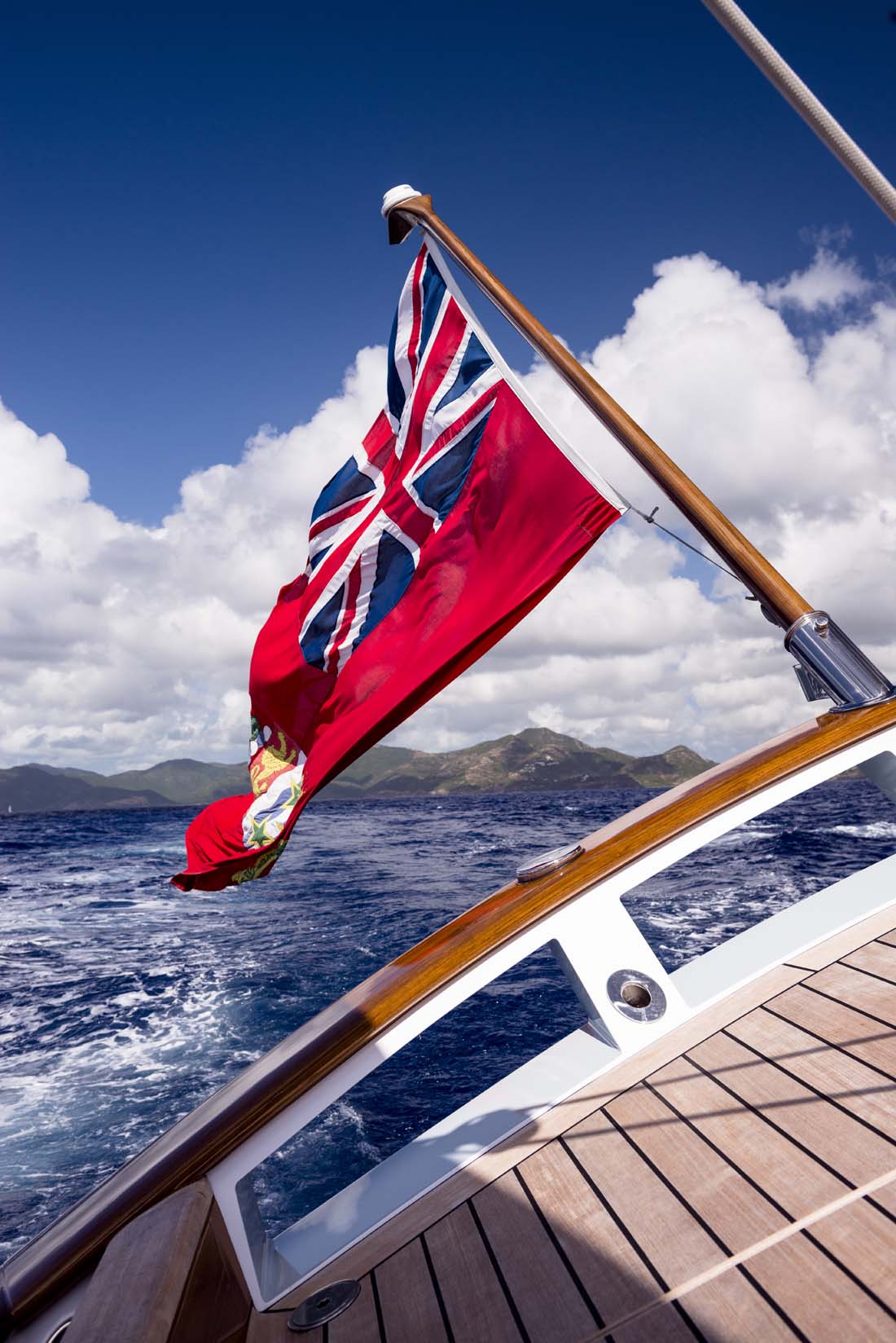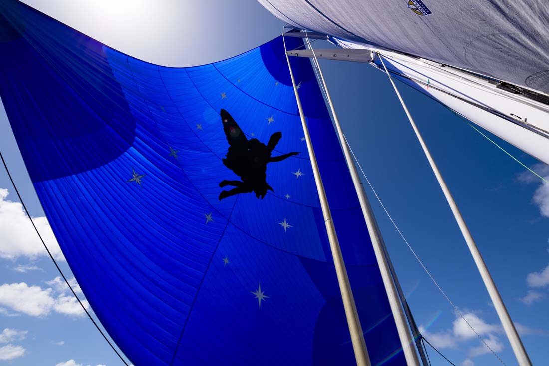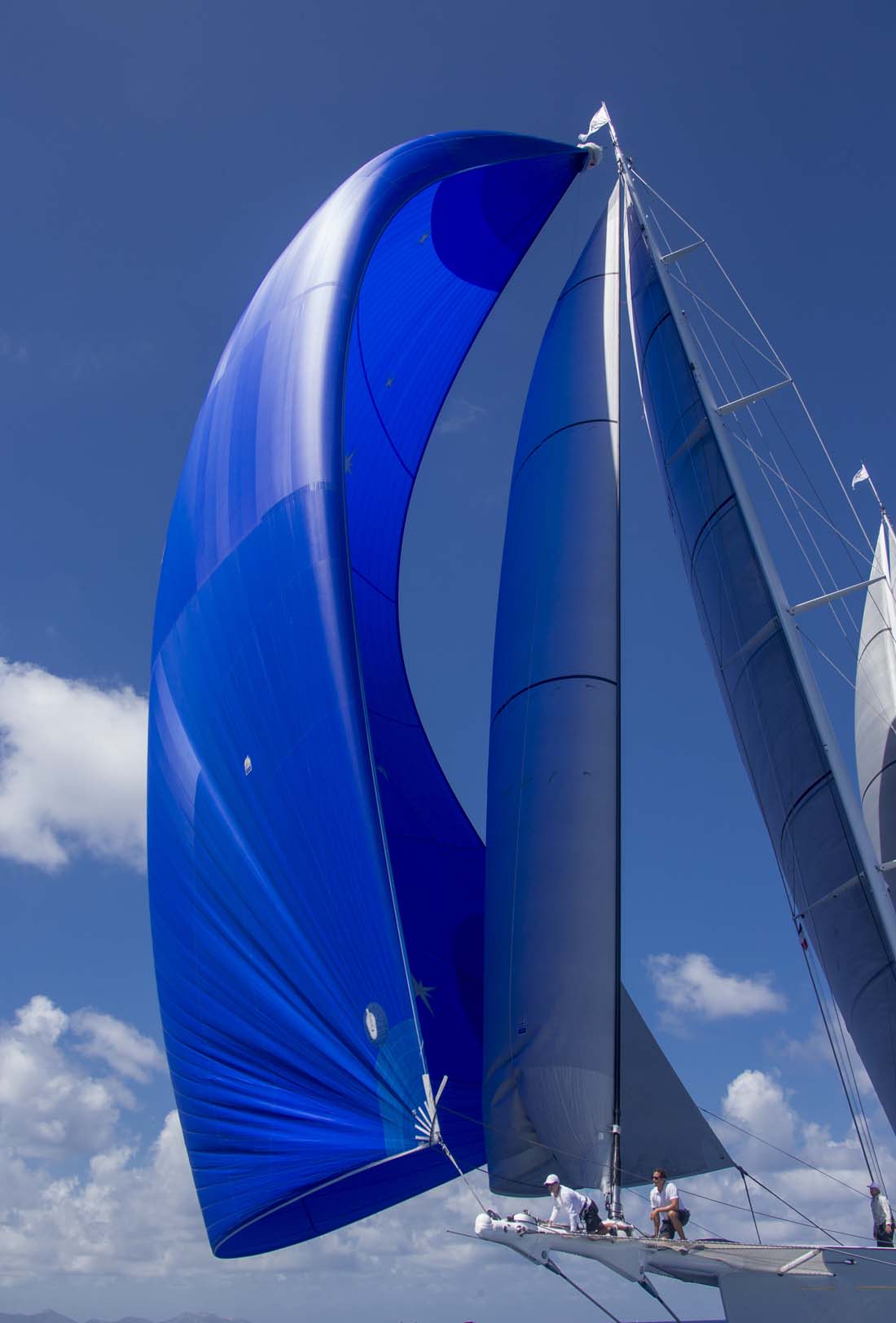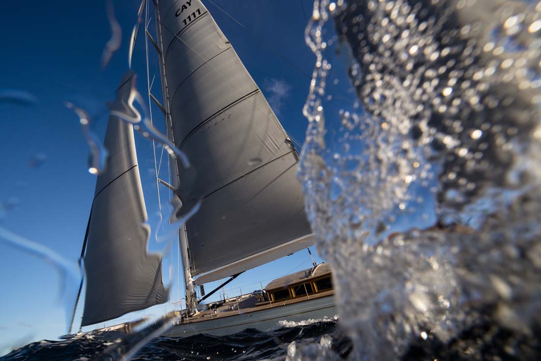 project, we developed five different hull lines plans with varying prismatic coefficients and volume distribution, although all were based on the same waterline length and displacement.” The hull that Elfje is fitted with reduces the slamming sometimes associated with plumb bows. The ketch-rigged Elfje additionally has a hydraulic lifting keel. The carbon fiber bowsprit (rated for 150 tons of compression) reduces weight in the bow and enhances downwind speed with the gennaker, asymmetric spinnaker, or Code 0. At her debut at the St. Barths Bucket earlier this year, Elfje shared top honors in her class.