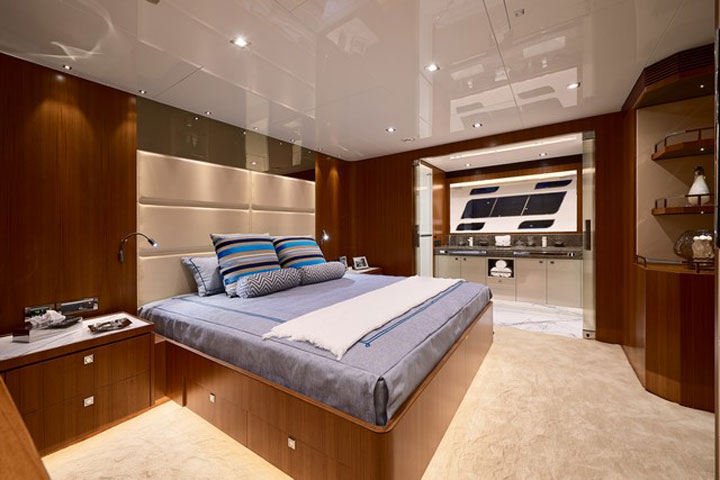 In fact, this first E88 Open Flybridge was created with American customers in mind. The Horizon Yacht USA team worked with the shipyard’s in-house naval architecture and interior design departments to outfit her accordingly. You’ll find walnut soles and teak bulkheads paired with primarily neutral colors for what Horizon calls a modern coastal decor. Marble soles lend a little more luxury at the entrance to the saloon from the aft deck, plus the galley. Horizon also made the leather and teak coffee table in the saloon and holly-inlaid teak dining table.