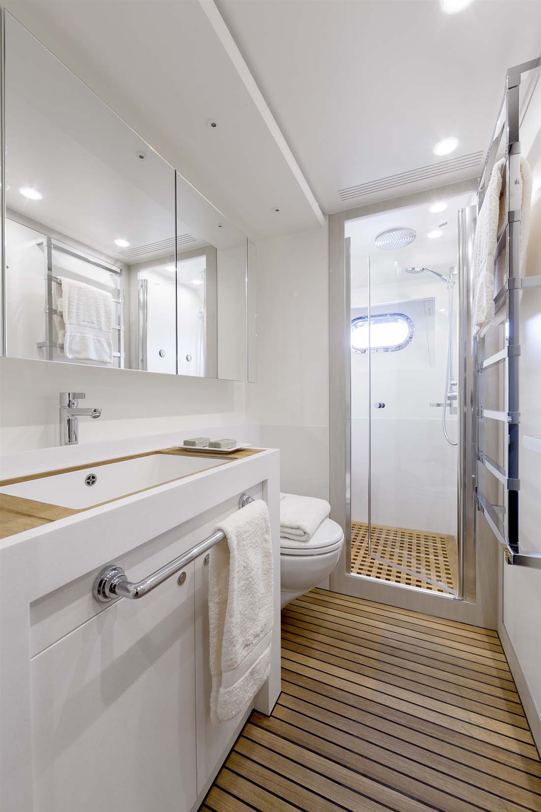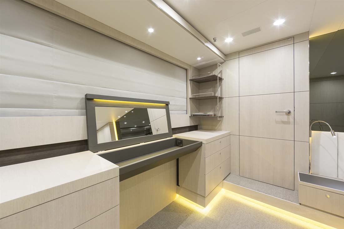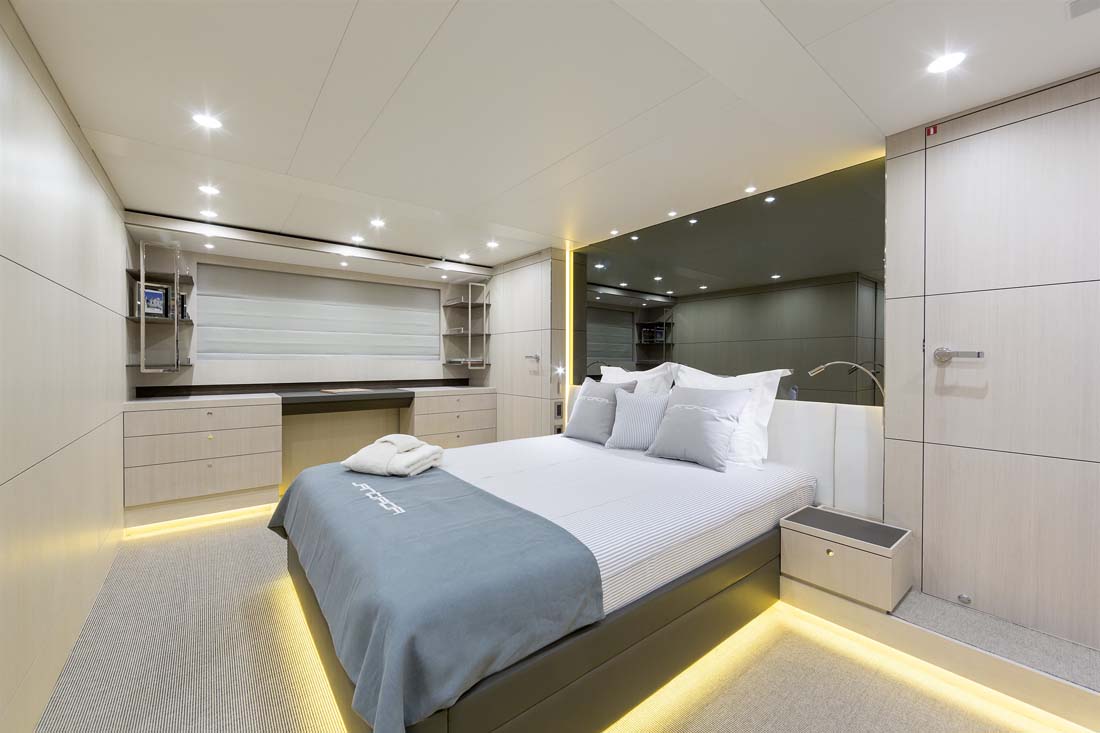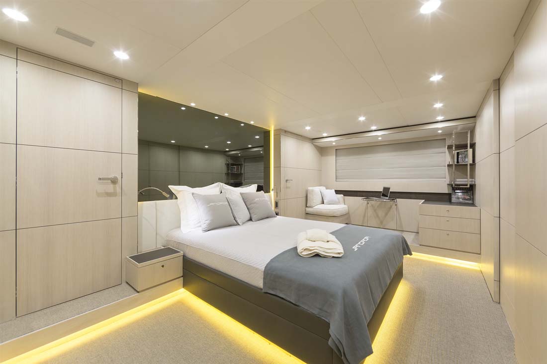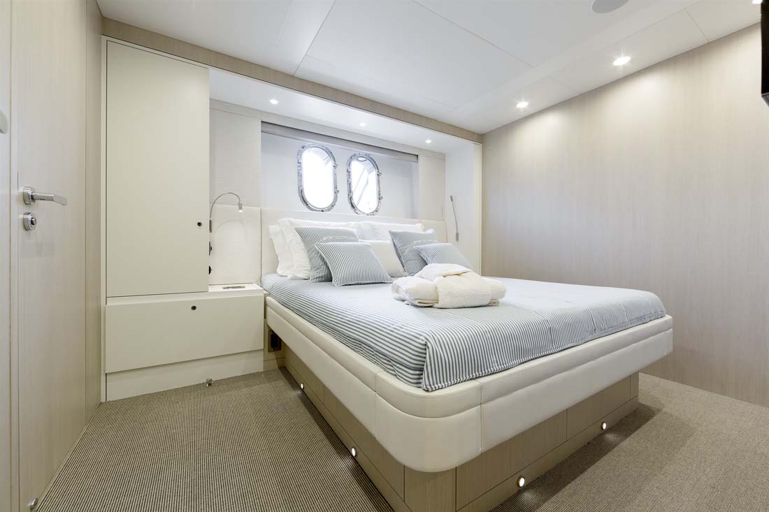 Being an experienced yacht buyer, Jangada’s owner had a specific vision for the general arrangement, too, which will surely strike you as being unusual. It’s due to the crew’s quarters being forward on the main deck. Two crew cabins share a head and accompany the crew mess here. Not unusual, though, is the dedicated stairway leading down to the owner’s and guests’ staterooms for quick service. The master extends full beam down here, complemented by a VIP stateroom and two twins.