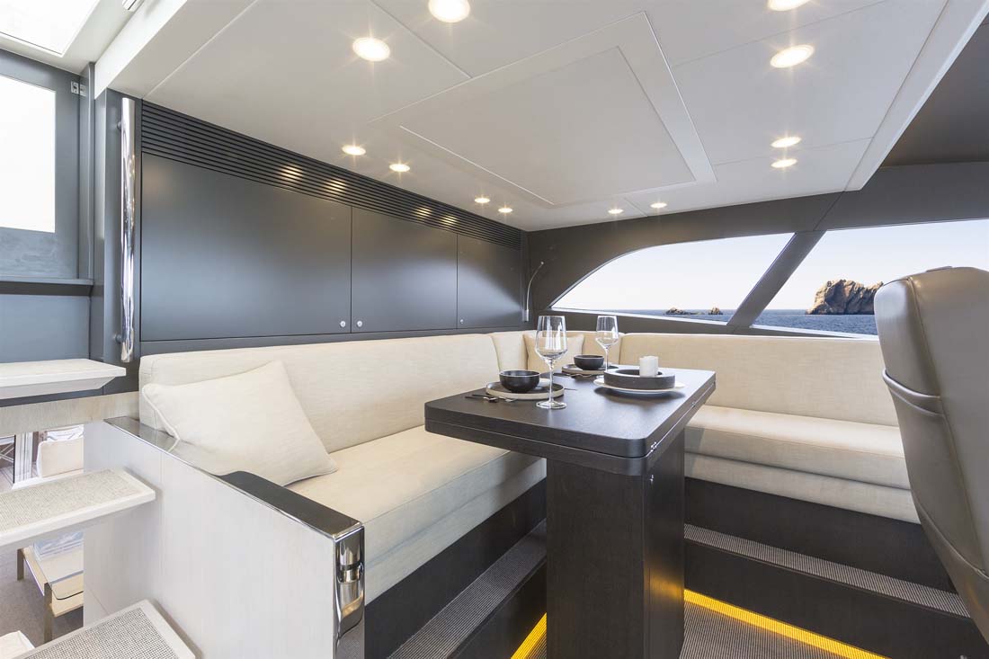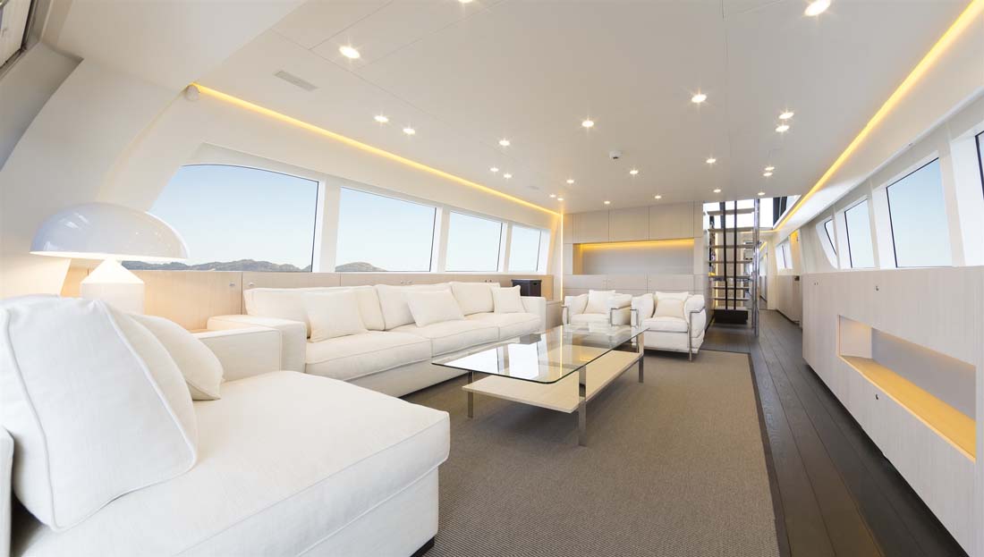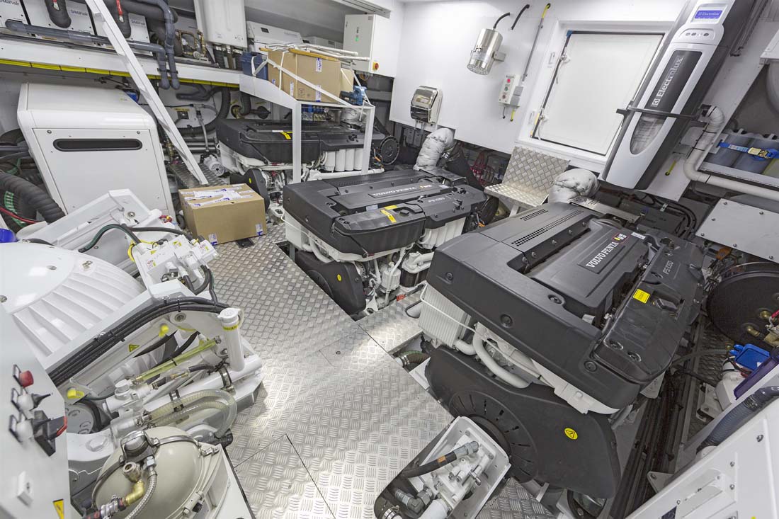 The owner selected Nick Top, an industrial designer, to execute the interior. He collaborated with Guido de Groot Design, who developed the Continental Three Series with Van der Valk Continental Yachts. The photo gallery below reveals a plethora of whitewashed oak, lending a bright, airy feeling to Jangada. That open feeling is preserved by a floating stairway to the raised pilothouse and flying bridge. The latter includes an additional helm plus a sunbed, dining area, and toy stowage (a PWC and a 15-foot, or 4.5-meter, tender).