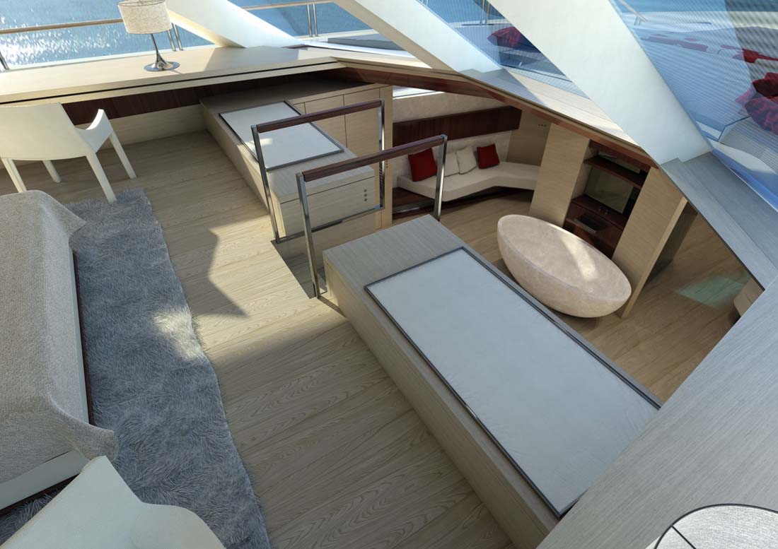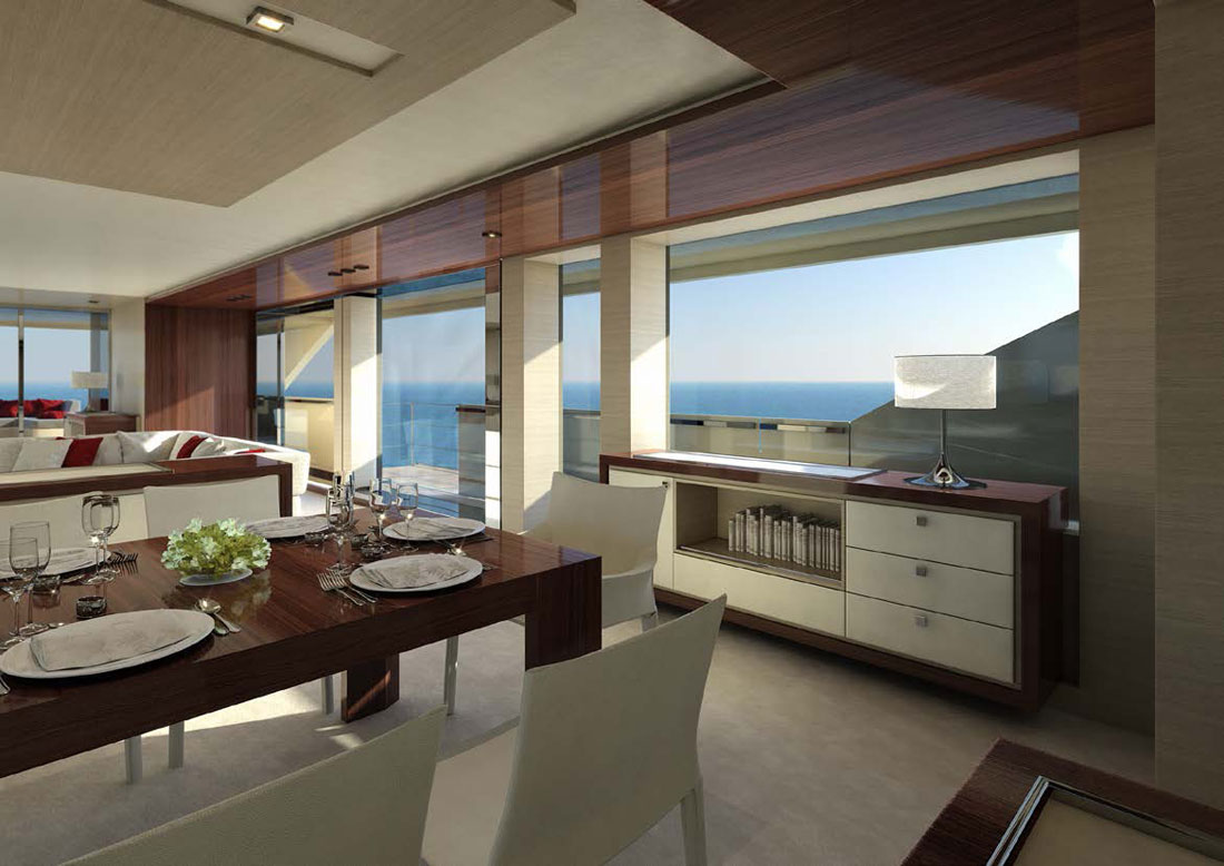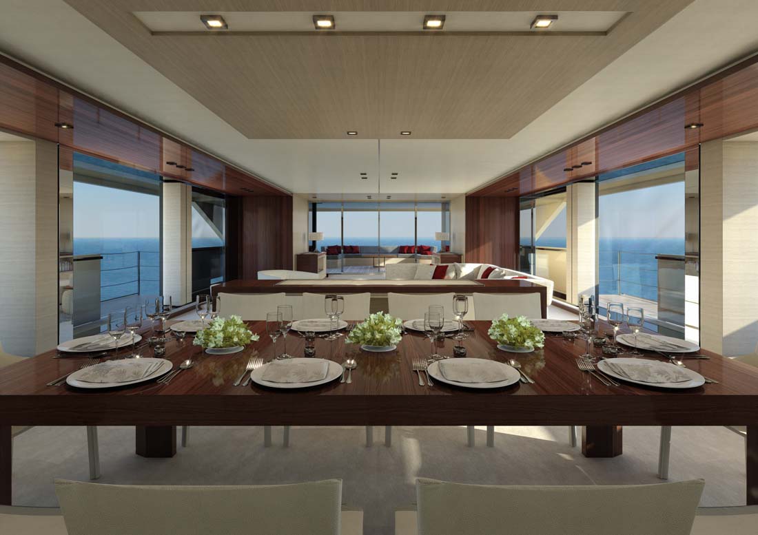 The all-aluminum SF line gets its name from SF Yachts, Mondomarine’s Middle East dealer. The two companies believed the market was ready for projects whose streamlined looks were paired with unexpectedly voluminous spaces inside and out.