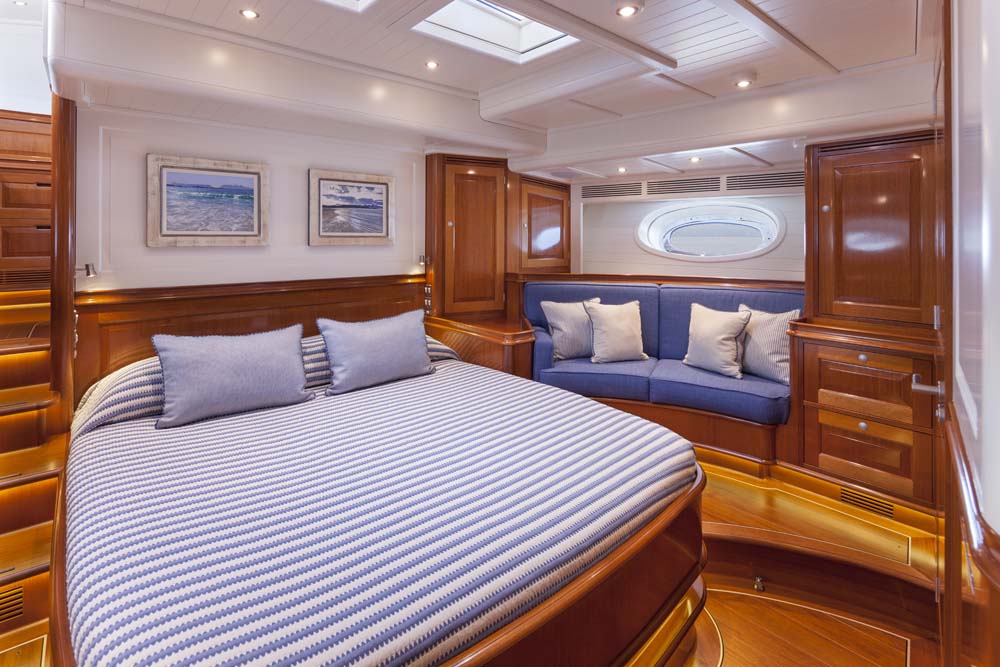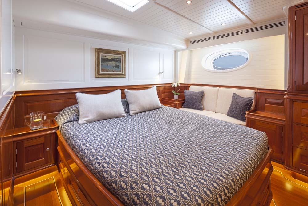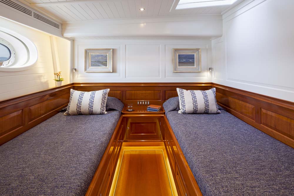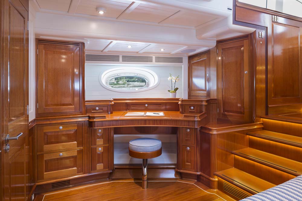 The owner of Atalante was also attracted to the extra room afforded by this 127’3” (38.8-meter) design in comparison to his prior yacht. The added elbow room was as important for him and his guests as it was for his crew. In fact, the double crew cabin (in addition to the captain’s cabin) contains an en suite head. The captain’s office can double as an extra crew accommodation if needed, such as for racing. Even with the additional floor space, though, Atalante contains just two guest staterooms; the owner saw no reason to squeeze in more. Classically rich, warm mahogany wood, combined with equally classic, white-painted overheads and paneling above wainscots, characterizes the entire interior.