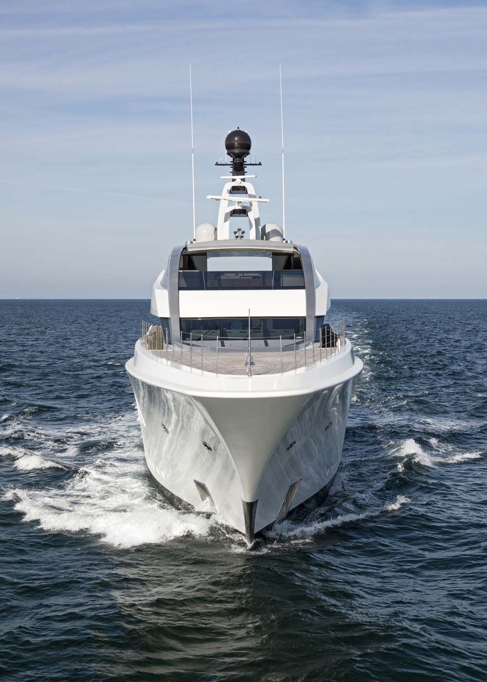 Yacht watchers should have no problems keeping track of Halo on those journeys, either, due to her distinctive styling. Surely the first things your eyes are drawn to are the huge silvery arches on her superstructure. You can better see them in the photos below. They’re among the many truly personalized touches requested by the owner. Eidsgaard Design,  which styled Halo with De Voogt Naval Architects, considers them a signature element.