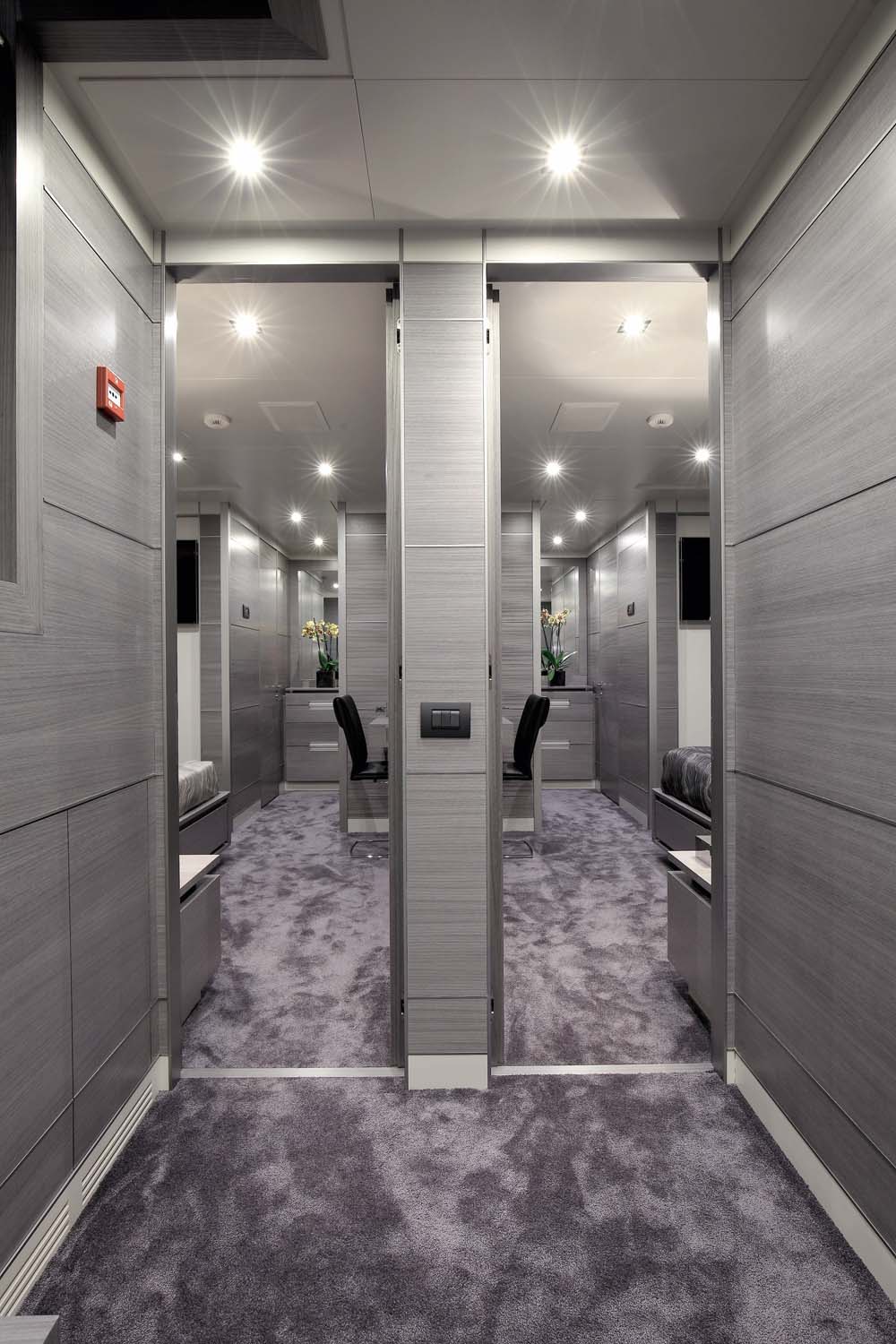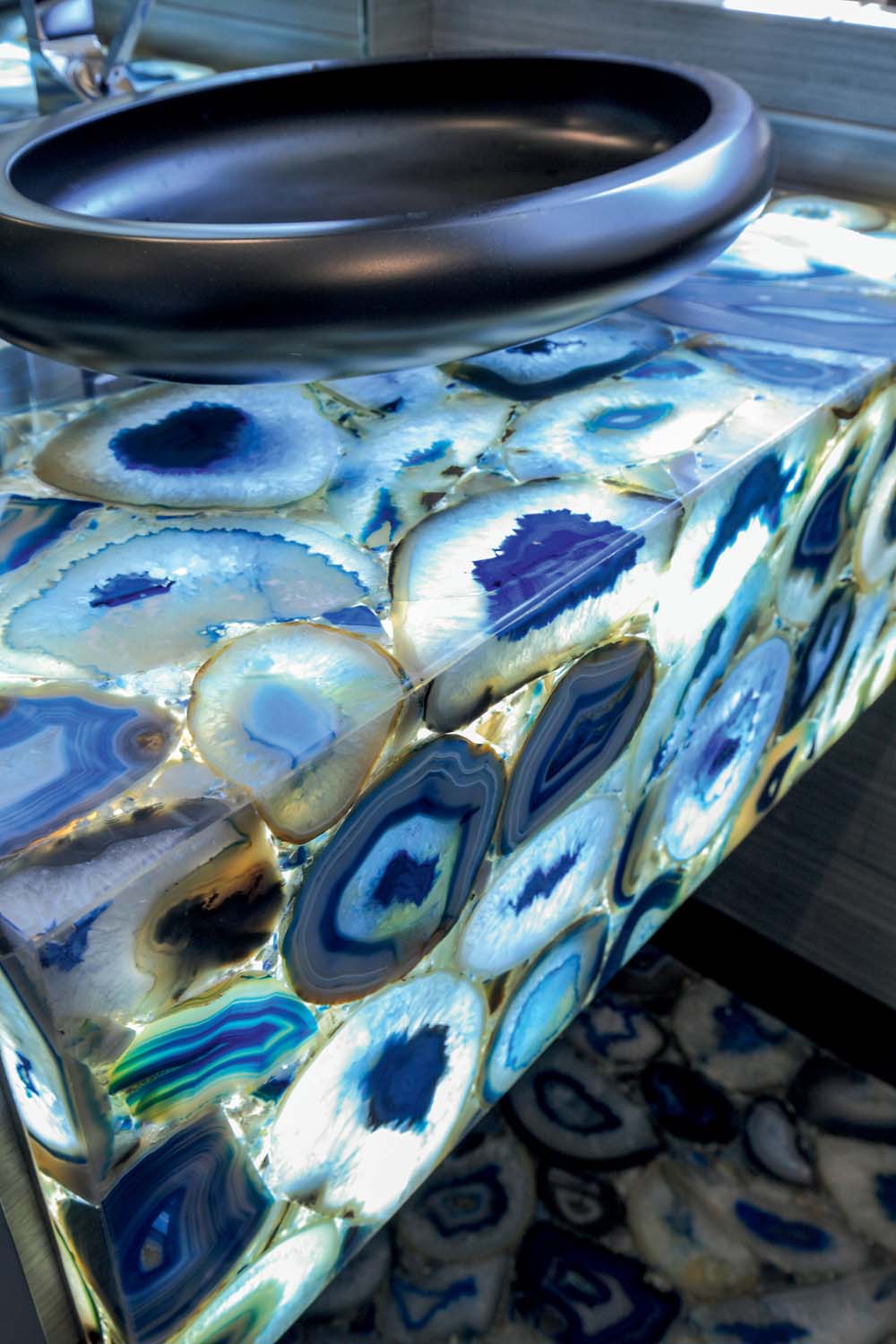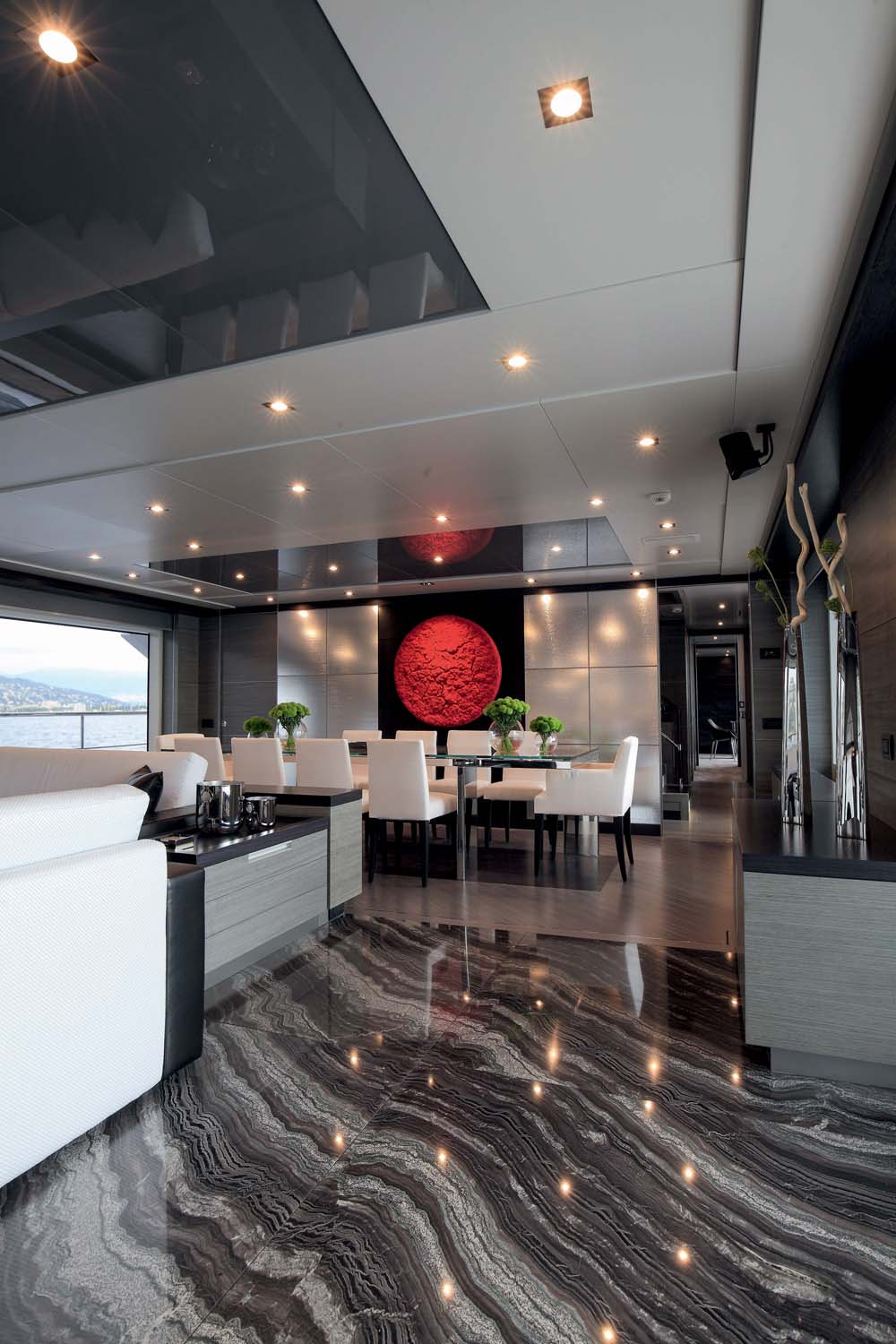 Lest you believe there’s a lack of diversity in the decor, fear not. As the image at top reveals, the dining room is punctuated by a bright circular relief painting. The main-deck master suite has a forward wall made of different colors of resin. And wait until you see the day head photo in the gallery below; multi-colored stone, enrobed in resin, is a delight.