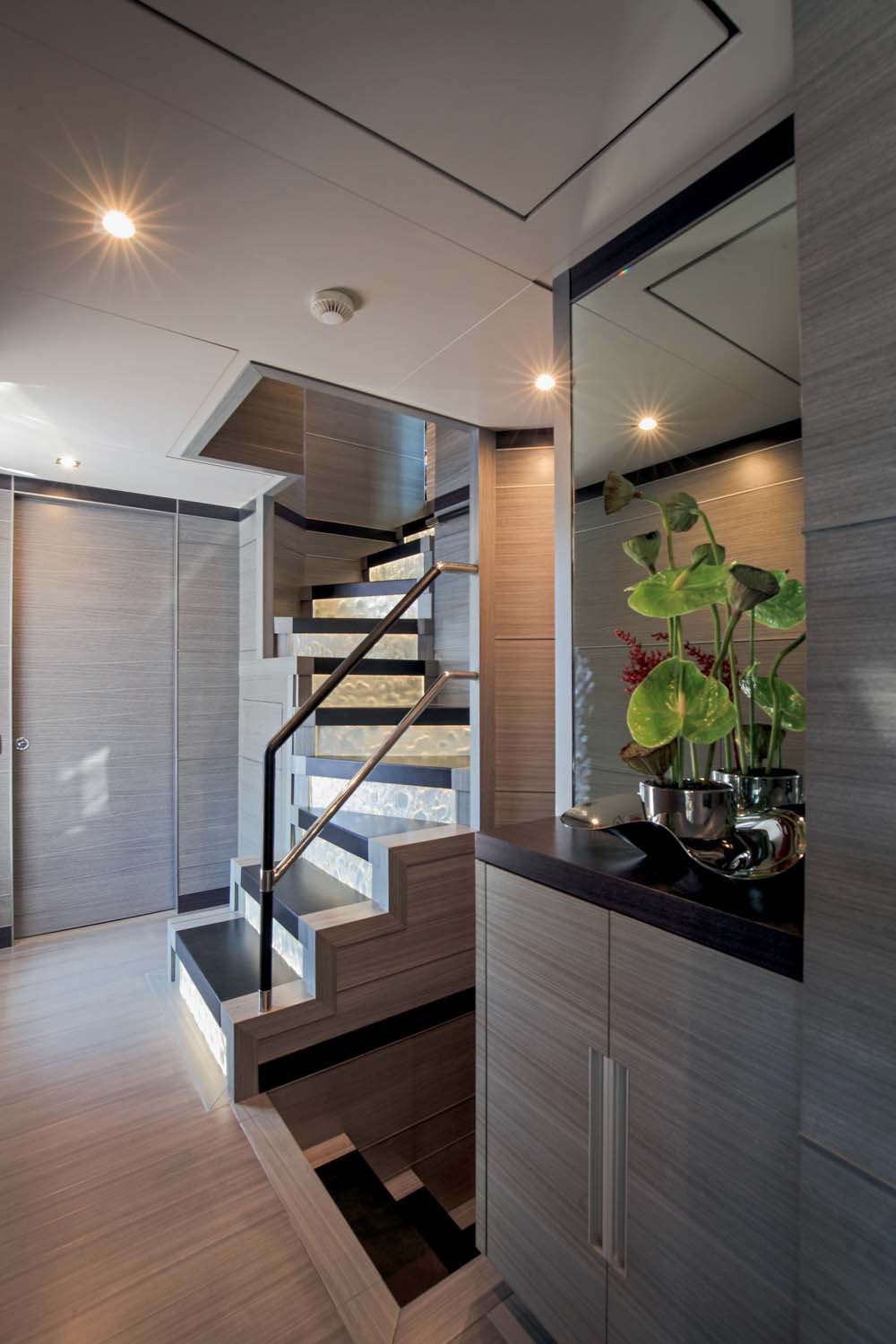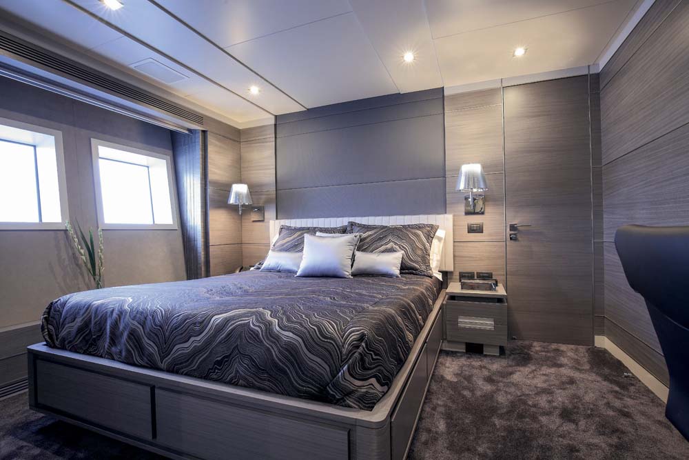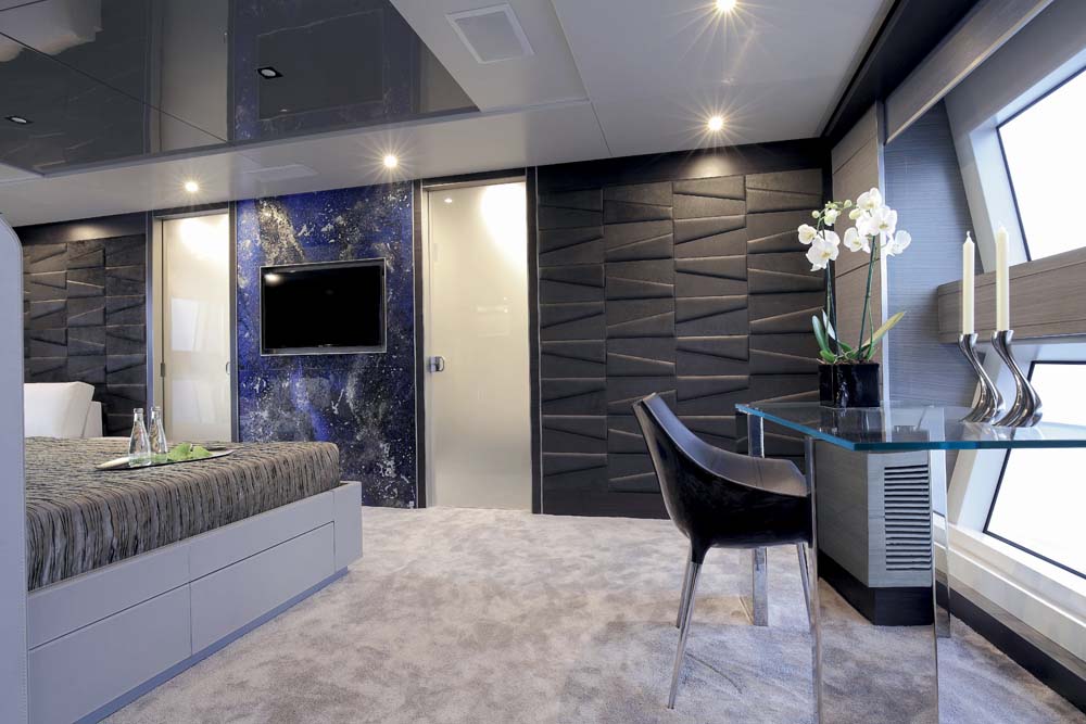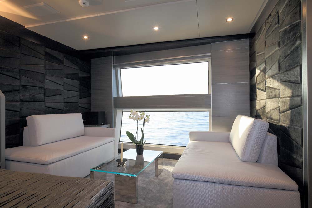 Upon stepping inside Iron Man, you see quite vividly how the theme of technology plays out in tones of gray, black, and white. The owner worked with Alfred Karram, Jr., a designer who strives for inventive space planning and architectural details. From the granite soles in the saloon (bold and beautiful, at that) to the backlit molten-glass risers of the stairway down to the guest stateroom, there’s many a corner to catch your eye. Black leather, gray-stained paneling, white and silver textured fabrics, glass and stainless steel tables… Iron Man has these and more. Even the alfresco areas aboard Iron Man are treated with gray and white gelcoat. (The teak decks remain their customary wood tone, though they’re still artistic. The planks are set at angles, coming together like the tip of an arrow.)