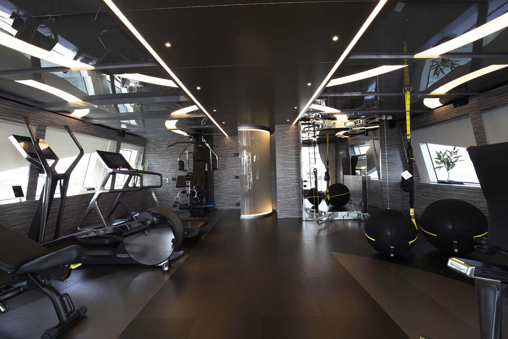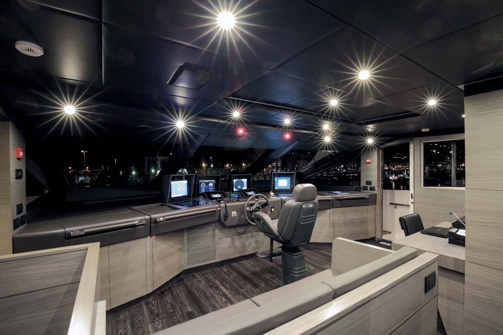 The Vivace 125 bears what Benetti calls a D2P hull form, meaning Displacement to Planing. It incorporates a wavepiercer bow and azipods. Equally important, it’s designed to burn less fuel than traditional semi-displacement yachts do at the higher speeds they reach. Simultaneously, the D2P design enjoys low fuel consumption at slower speeds, similar to full-displacement hull forms. Benetti has not released her fuel-burn figures, but says that Iron Man reached a 24-knot top end during sea trials, 2 knots more than expected. The yacht’s superstructure is additionally constructed with carbon fiber for a reported 40-percent weight savings over traditional all-composite construction.