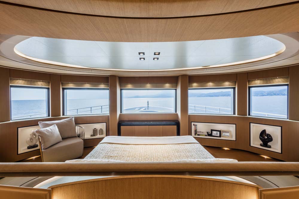 While no one begrudges a yacht owner reserving ample area for the master suite, this doesn’t mean guest staterooms still all have to be below decks. Suerte’s owners have four guest staterooms on the main deck—underscoring the idea of making the onboard experience as relaxing and enjoyable as possible. They enjoy terrific views, and they’re steps away from the action back aft whenever they want to join in. This particular stateroom, to be used by the owners’ son when Suerte is on private cruises, will bring a smile to the faces of sports fans. As for the owners’ suite, it’s up one deck. The apartment-like arrangement includes a study. The bed is raised two steps to benefit from the views out over the bow. The owners have access to a sunning area outside, too, which can be made private via locking side-deck gates.