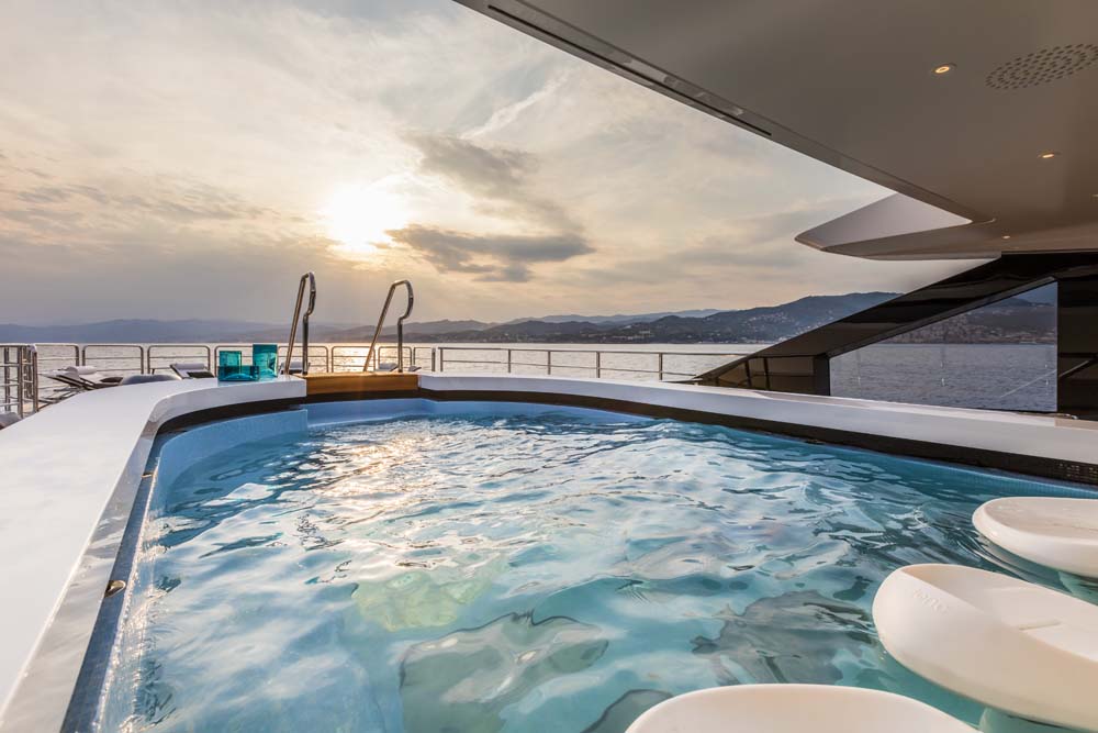 The 227’4” (69.3-meter) Suerte, the first delivery from Tankoa Yachts, was conceived around this very idea. Few things about her arrangement are the same as they are aboard other megayachts. Take the way you enter the interior. Rather than have traditional sliding aft-deck doors, Suerte has two offset entries into a relaxing reception lounge complete with a bar. A central set of stairs leads directly down to the beach club, too. It makes sense. When it comes to vacationing on the water, don’t we all want to get straight to the “business” of unwinding?