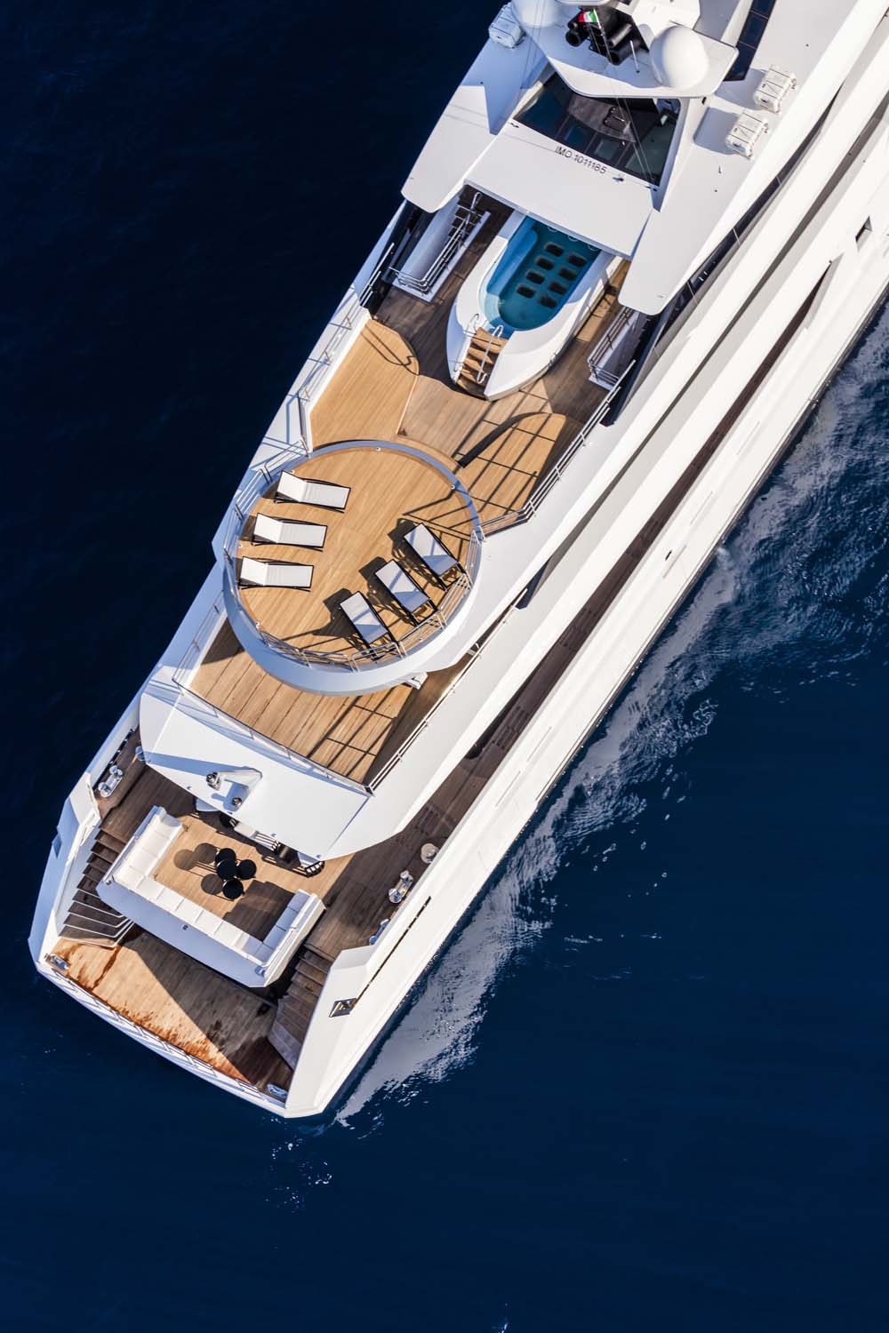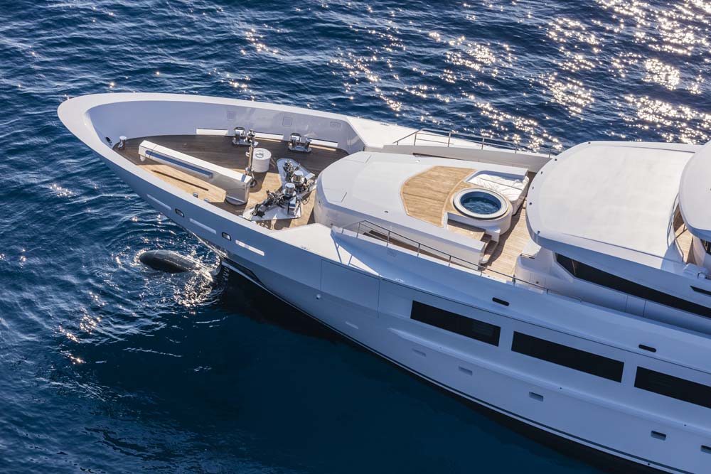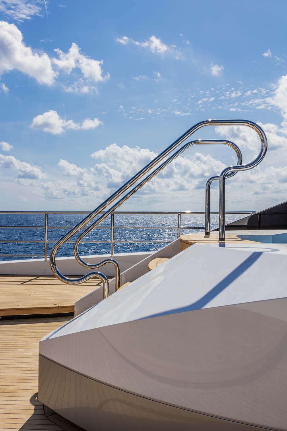 With a gross tonnage of 1,467, the steel-hulled Suerte feels as voluminous as she is. Enhancing guests’ comfort is her RINA Green Plus certification. Green Plus is a voluntary notation indicating compliance with strict environmental-oriented conditions. Suerte also employs additional sound-reducing methods for comfort. One example: using steel vs. aluminum forward in her superstructure. When a yacht encounters large swells, she automatically loses some speed, which can cause vibration. Tankoa Yachts determined that steel here, plus the customary method of “floating” floors, bulkheads, and overheads, can greatly quash this. And, crew comfort was equally important to the owners of Suerte. That’s why the two crew messes (yes, two of them) are elbowroom-friendly, why the cabins for 18 hands are nicely sized, and why the dumbwaiter and service pantries are properly planned for small and large parties alike.