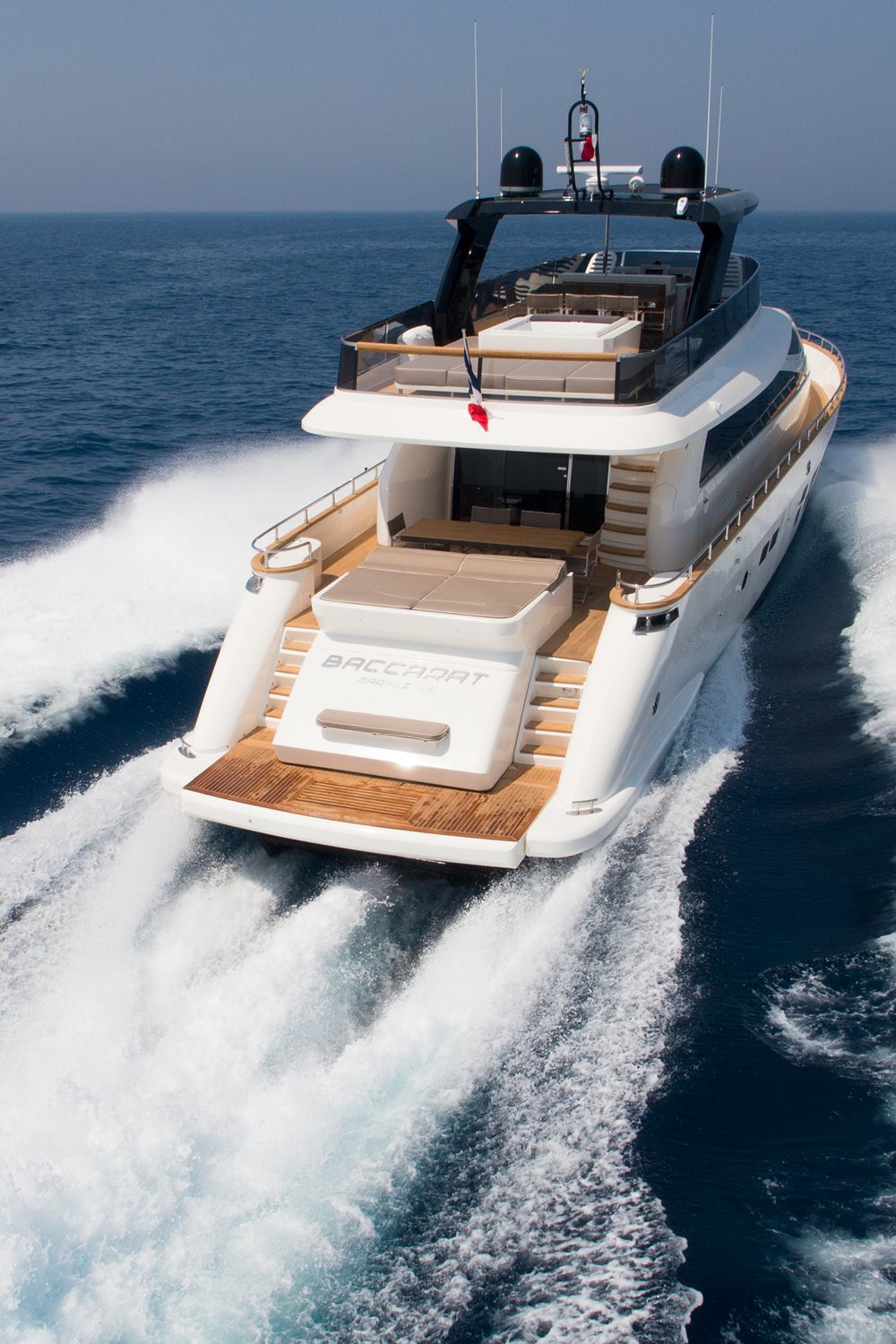 Baccarat, with a 20’7” (6.3-meter) beam, is also available for charter for €50,000 per week (about $53,125 at press time).