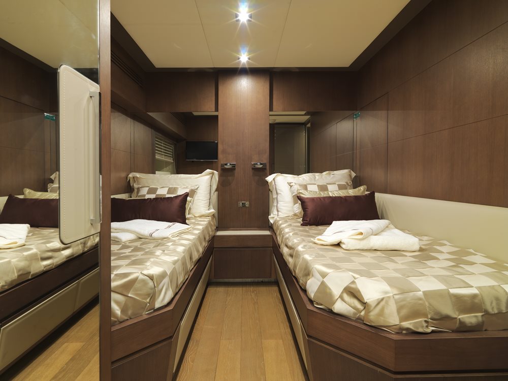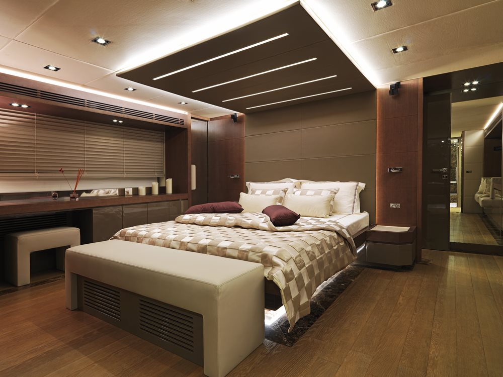 The Amer 94 series offers owners a choice of multiple stateroom configurations. Baccarat has four staterooms, all below decks. Both the master and the VIP are full beam, too. Alternate arrangements include three staterooms, where all can be full beam, too, or five staterooms. Regardless of head count, crew’s quarters are below decks, with Baccarat having three hands onboard.