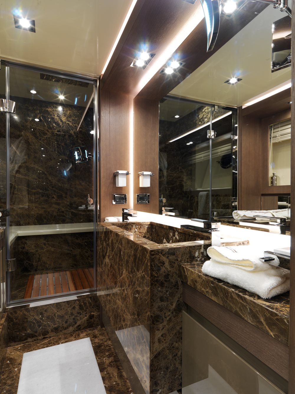 The semi-custom Baccarat makes quite a statement with her decor. Bookmatched white onyx slabs lead the way, literally and figuratively, through the saloon and dining area. Yet another marble rims the room and the bed in the master stateroom.