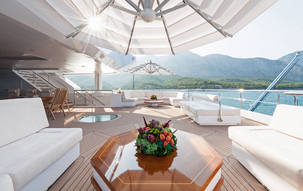 Focus Yacht Design says the owners of Irimari relayed few requirements or restrictions. They further welcomed fresh ideas to living in an environment ideal for relaxing and entertaining. The way spaces are arranged makes them feel inviting and sophisticated, even snug. Interesting enough, the atmosphere here is only slightly different than the studio’s original renderings. Light woods like bleached oak mix with rich ones like Macassar ebony, plus metals like copper and stainless steel. Mosaics, marbles, and more come into play, too. They’re all set amid colors and motifs taken from the sea.