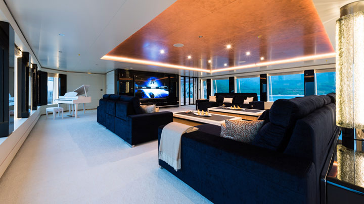 An excellence sense of Irimari’s volume comes via the grand stairway winding its way through the decks. It’s grand indeed: elbowroom-friendly, and a visual feast. The design of yacht stairways seems mostly driven by shepherding a guest up and down, with emphasis on “a.” (Not unlike engine rooms: leave enough room to put in what’s necessary, with nothing more and nothing less.) As Focus Yacht Design executed the passageway on Irimari, that need not be the case. Note the rich blue walls, adorned with an abstract kelp forest. What isn’t visible, unfortunately, is a 16-foot-high HD screen, rising alongside the stairway, displaying bubbles.