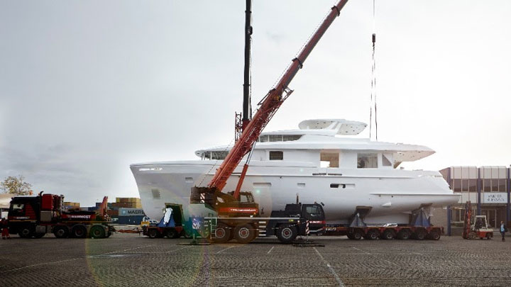 Last weekend, a 98-foot (30-meter) Matica model, set for a 2016 delivery, saw her hull and superstructure joined together (below). She’s the first of the Moonen Caribbean series superyachts to be signed by a buyer. Work halted over the summer, though, when Moonen filed for what’s termed suspension of payment. It’s a restructuring option in The Netherlands to avoid bankruptcy. It resulted due to issues with Altos Hornos de Mexico (AHMSA), the largest integrated steel plant in Mexico. AHMSA was financing a Caribbean series superyacht under construction on spec, a 121-foot (37-meter) Martinique model. Due to steel prices dropping dramatically earlier this year, AHMSA pulled out of the build. Even though the Matica model was being financed separately, Moonen’s cash-flow problems impacted progress on her.