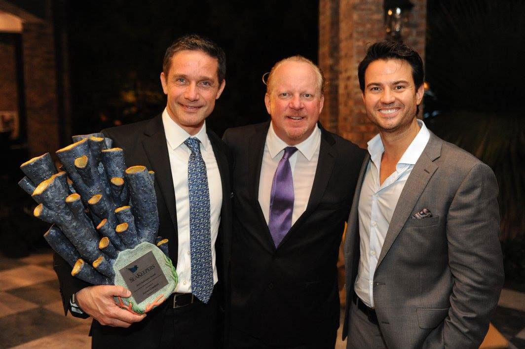 Jean-Michel Cousteau and Fabien Cousteau are, of course, famed members of the equally famed Cousteau family. But, first and foremost, they are father and son. And the father (background, at left in the photo) surprised his son (center) at the annual International SeaKeepers Society Bal de la Mer last week. Jean-Michel Cousteau presented him with the ocean-advocacy organization’s prestigious SeaKeeper Award.