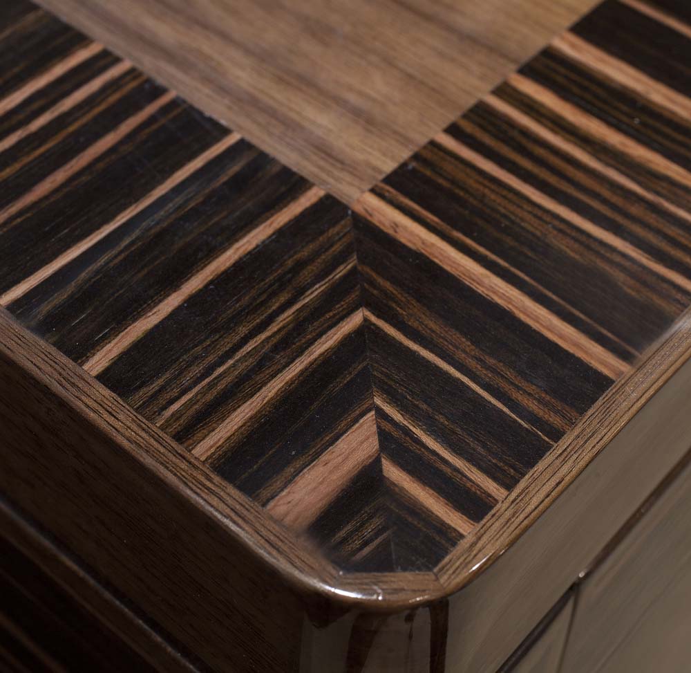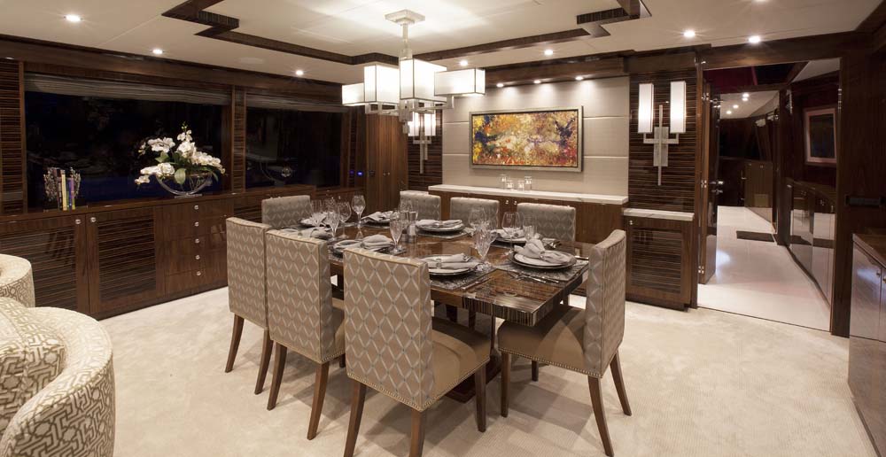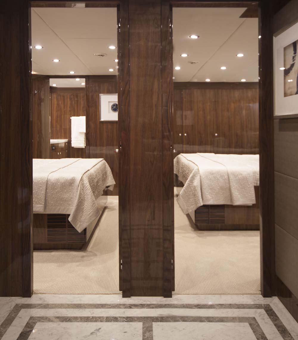Aboard a 101-footer, space is particularly at a premium. Cutting Edge underscores how walk-around decks can be incorporated without compromising the look or feel of the 21-foot (6.4-meter) beam. The chef says it’s important to be able to go up and around without walking through the saloon when guests are aboard. (The dominant wood here and throughout Cutting Edge, by the way, is walnut with a high-gloss finish. It’s accented with zebrano, also high gloss.)