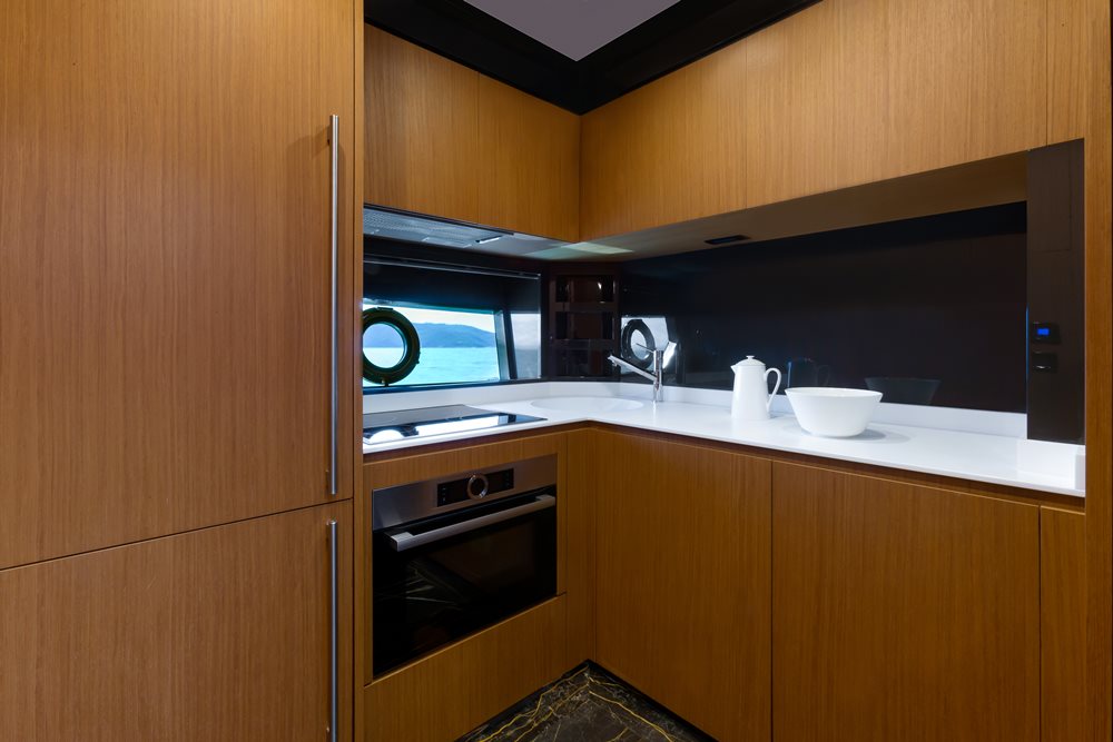 Those staterooms include a full-beam master aft, down two additional steps. A twin is off a foyer, to starboard, with a VIP fully forward. Given that Riva devotes the 76 Perseo’s main deck mostly to relaxation (though a helm is also here), the galley also goes below decks. It’s between the master and twin cabin. Owner-operators may not mind, though. Those same owner-operators will appreciate the inclusion of a washing machine stowed off the foyer. A dryer is available on request.
