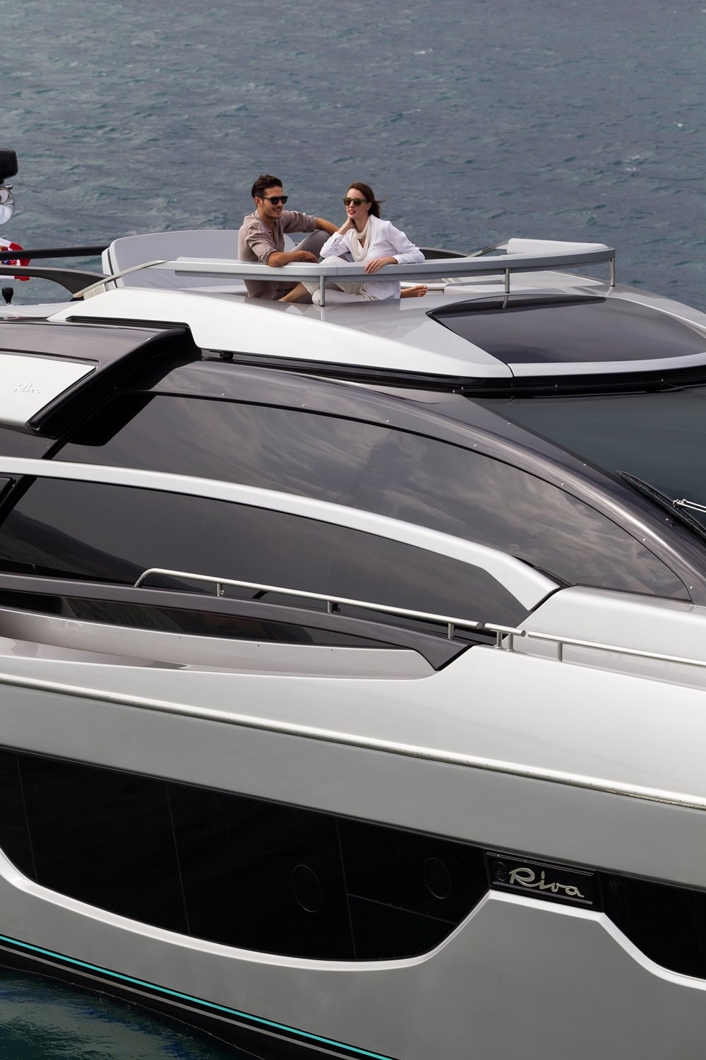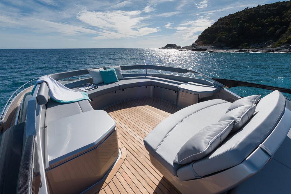 Further optional for alfresco fun is a sunbathing area for the aft deck. The standard configuration here is a seating area. Regardless, Riva includes a back-down station to port, adjacent to the crew-cabin access (beneath the stairs to the sundeck).