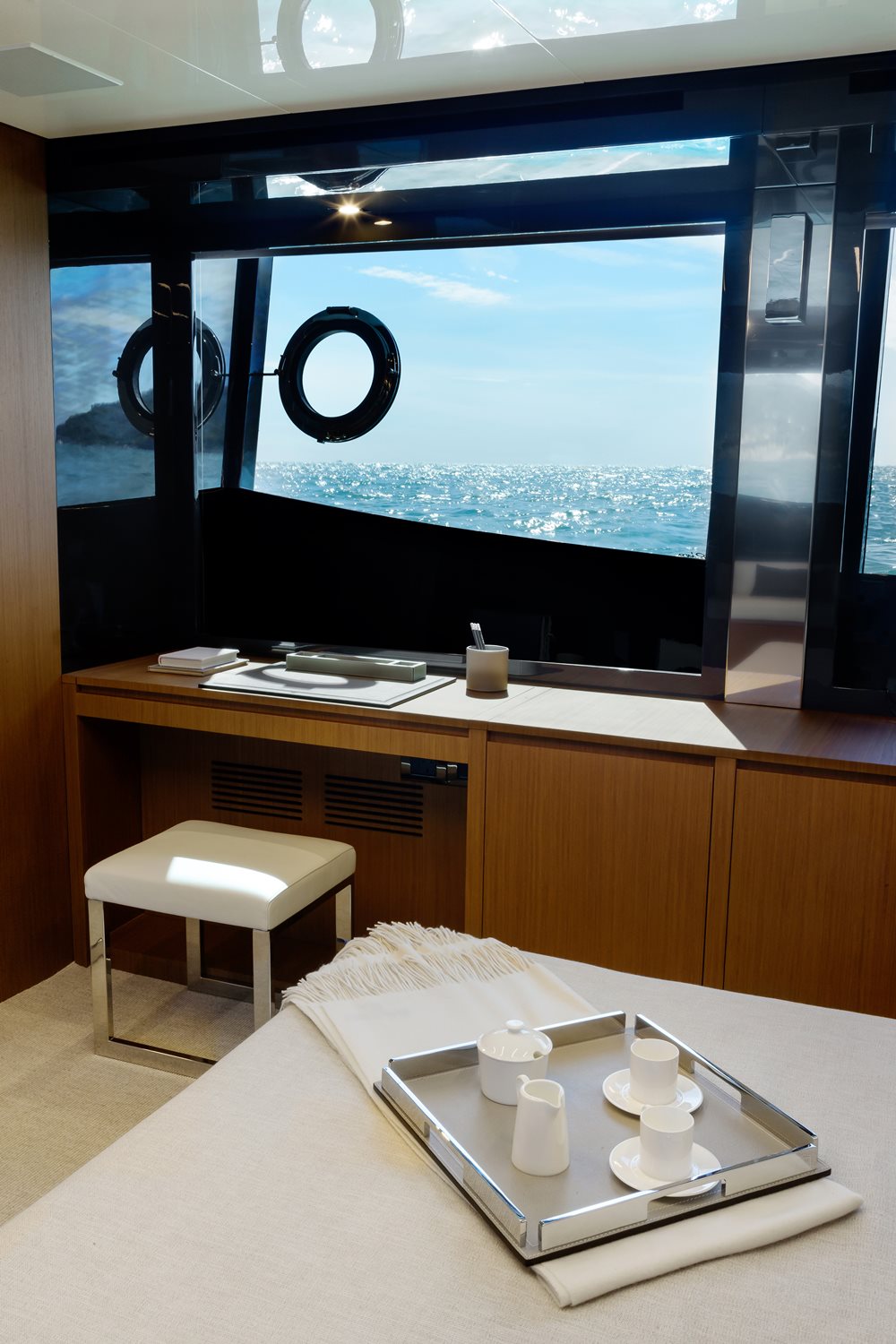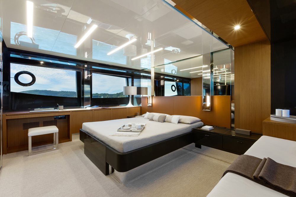 Further enhancing your experience onboard are contemporary tones and textures that don’t detract from the view. Lacquered black window frames combine with teak furnishings, stainless steel accents, caramel-colored leather, and grey carpeting on hull number one. Buyers of the 76 Perseo can, of course, select other woods and soft goods to suit the main deck and three staterooms below decks.