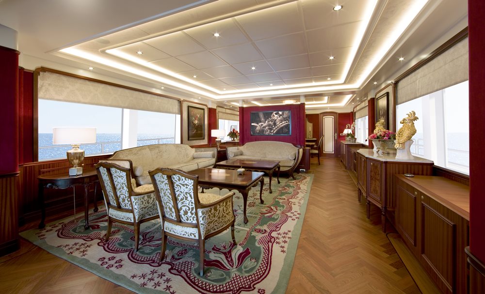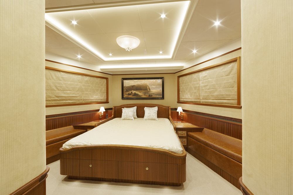 Surprisingly, given current trends, the owner of Santa Maria T requested his suite (above) be below decks. The area certainly doesn’t suffer in terms of comfort (below-decks accommodations are more comfortable in swells). It also doesn’t suffer from lack of space. In fact, about half of all the below-decks accommodations are devoted to Santa Maria T’s owner. The amidships suite includes both an office and lounging area. It, plus the three guest staterooms, show off marquetry akin to that above decks. Each stateroom gets a special en suite head, using two different tones of marble. None of the colors are found in the other heads.
