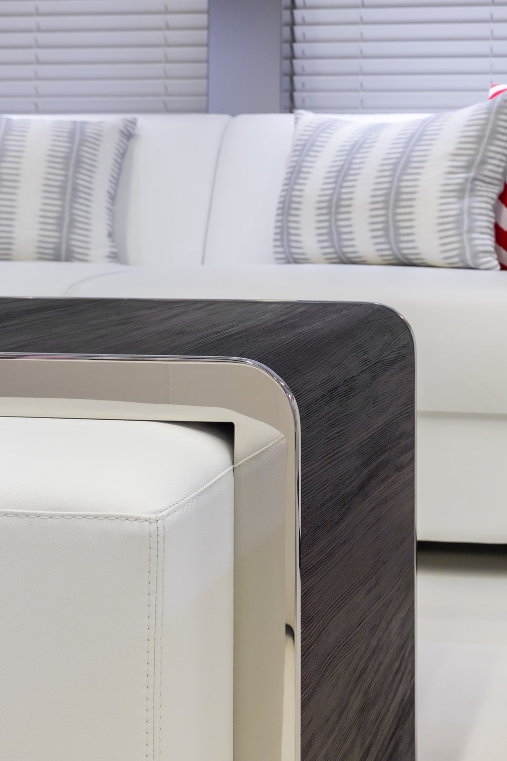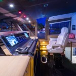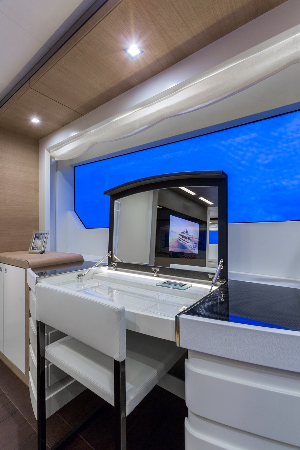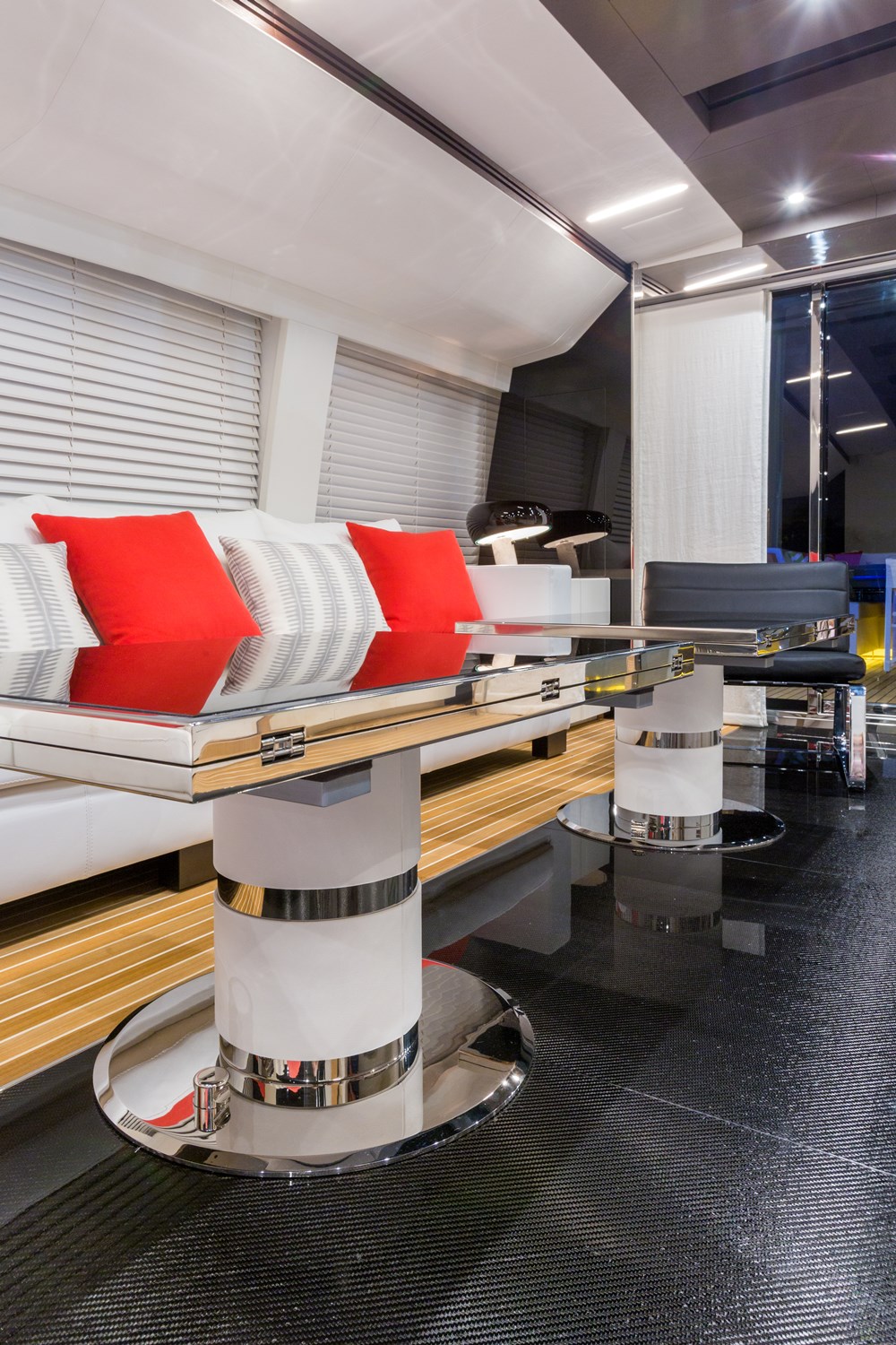 Even when they’re inside, everyone aboard Sophye can still feel as if they’re outside. The skylights in the skylounge (below), along with the liberal use of white lacquered surfaces, create a fresh feel. Cristiano Gatto Design and the owner wanted to avoid a “New York penthouse look,” so to speak. Nothing too fussy or stylized. Note the teak decking that rims the room. This isn’t to say that there’s no style, though. See the black section of sole? That’s carbon fiber. On a related note, the custom-made furnishings came from Astondoa itself.