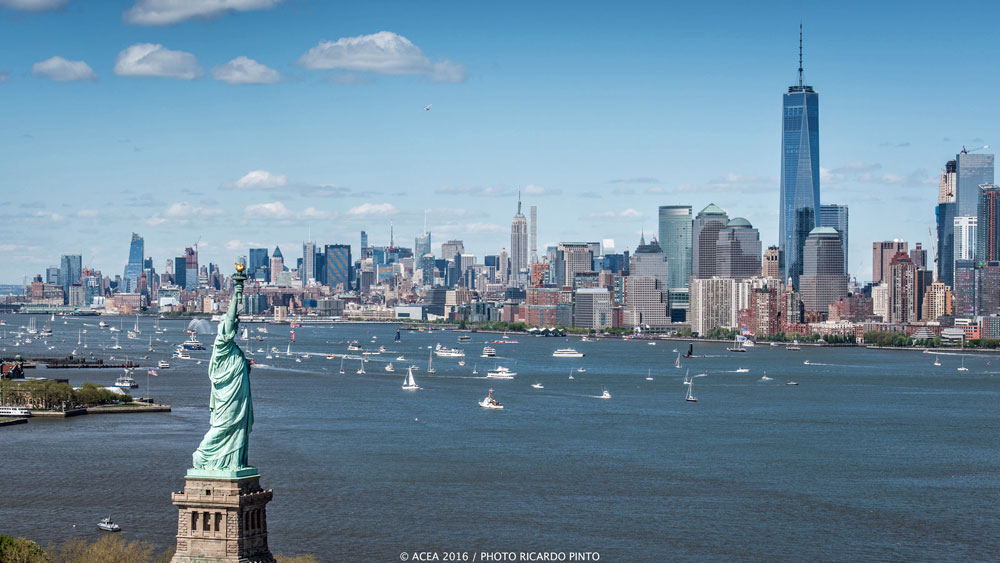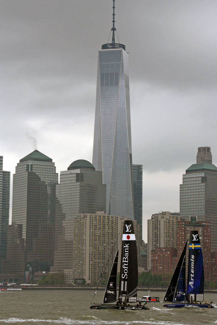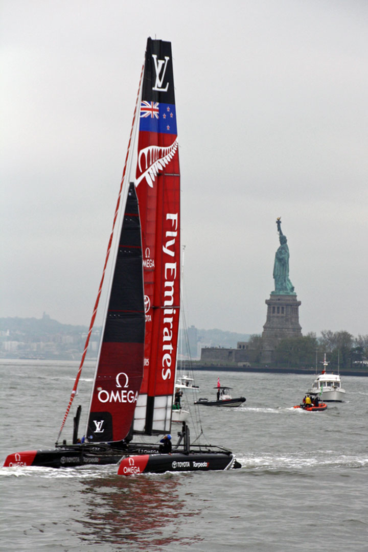 Race day two was a challenge as well, for far different, and better, reasons: ever-shifting, dramatic wind changes from 5 to 20 knots, and a roaring current of about 6 knots. The three scheduled races went off without a hitch… until Emirates Team New Zealand hooked the anchor line for the starting buoy in the last race. The same buoy punctured their AC45’s hull, too, and they took on some water. All seemed lost for them as they managed only fifth place for most of the race. That is, until the lee of Manhattan’s skyscrapers acted like an off switch for the breeze as the racers approached the next to last leg. With all the boats drifting in the current, it was anyone’s guess as to who’d be able to maneuver out of it. As if out of a Hollywood script, Emirates Team New Zealand caught a building gust, taking off on her hydrofoils at 16 to 20 knots boatspeed. If a boat were capable of leaving others in the dust, that would have been the case. She crossed the finish line, securing first place and 52 overall points for the Louis Vuitton America’s Cup World Series New York.