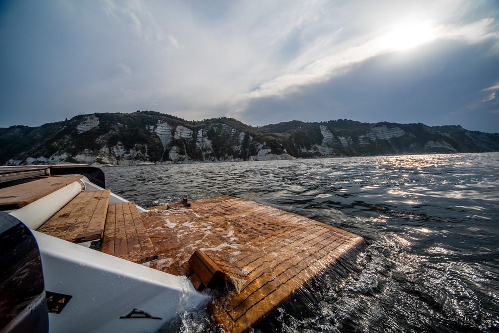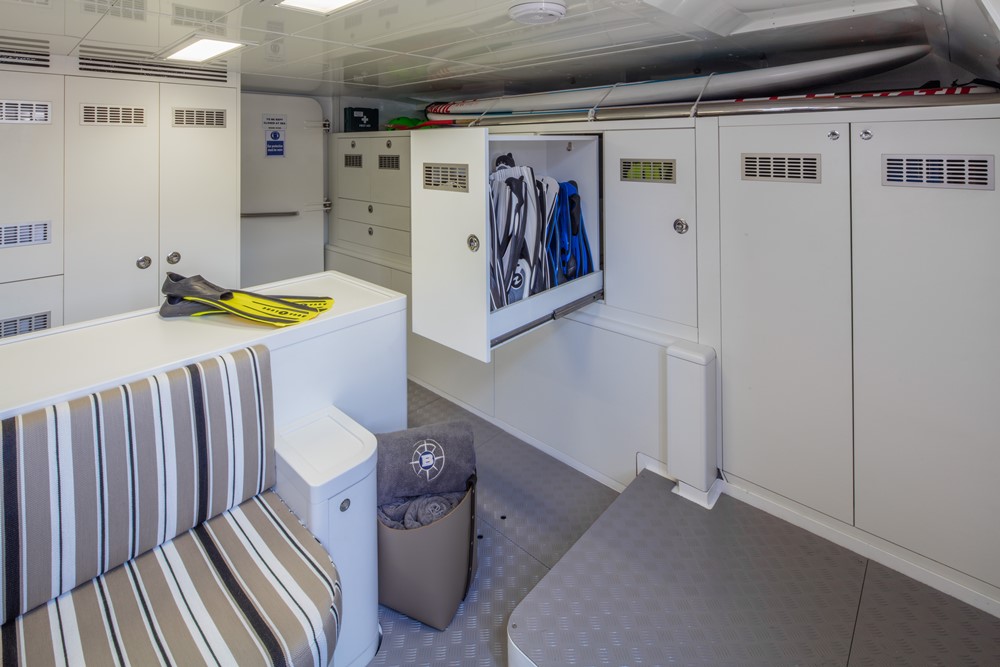The South American owner of Babbo and his family have plans to stay aboard until the bitter end of the summer. They just took possession last month, heading across the Adriatic Sea from Cantiere delle Marche’s headquarters in Ancona, Italy. Croatia and Montenegro are the first focus, with Greece and Turkey coming later this season. Diving is a priority. The design and build teams fashioned handy pull-out hanging lockers for fins and deep drawers for bottle stowage, in fact. There are further handy stowage areas for folding bikes, SeaBobs, and more.