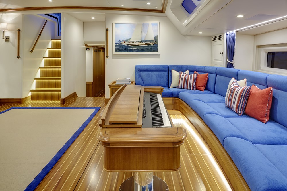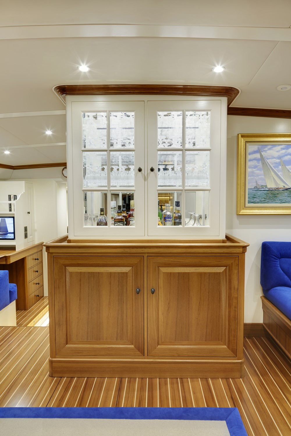 The interior of the owners’ Swan 77 served as the starting point for the new Cygnus Magnus. Teak enveloped the smaller yacht’s spaces, paired with teak and holly soles. Treasures from the owners’ travels appeared from room to room. Similarly, Cygnus Magnus has a traditional wood interior, using panels made of teak, fabric, and painted surfaces, plus teak and sycamore soles. (Yachting Developments’ in-house joinery department executed all woodwork.) Together, Adam Lay Studio, the owners, and their captain created a cozy, informal, and inviting atmosphere. A nice touch: antique finishes on door handles and bath fixtures, to avoid fussiness.