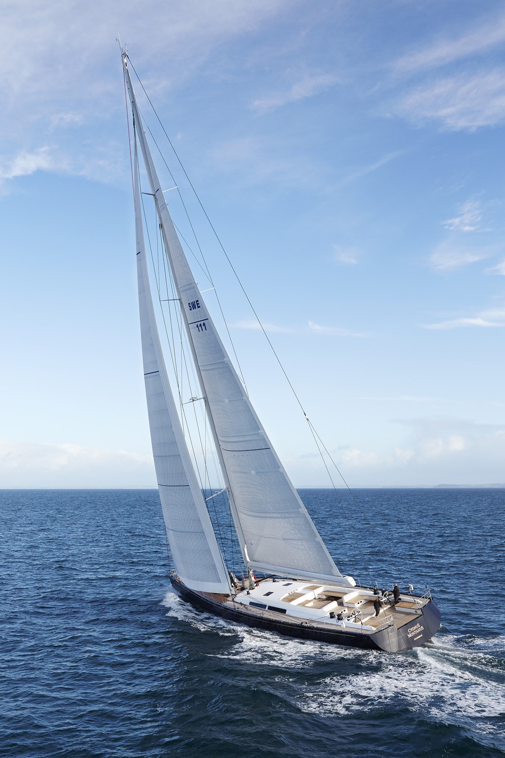The owners enjoyed global travels aboard their previous sailing yacht, a Swan 77. (They’ve owned her for more than a decade, too.) For the new sloop, the extra length would permit more family to come along, plus of course more comfort. They didn’t, though, want a significant-size crew. Cygnus Montanus still needed to be manageable by a small number of hands, no matter the conditions. Frers Naval Architecture prioritized that, along with ensuring she was fast and responsive. Further important: ensuring the deck layout was practical so that all, from the owners to the crew, could tackle tasks properly. Among the smart features aboard Cygnus Magnus are a roller furling boom and a telescopic keel. Carbon fiber construction keeps her light. Her carbon fiber mast rises 166 feet (50.5 meters) high, too.